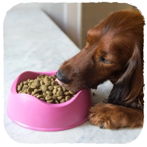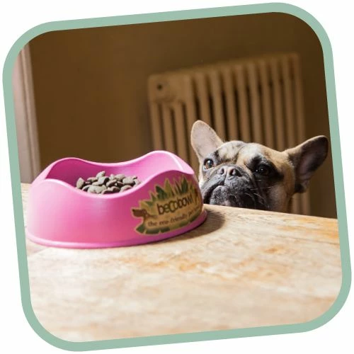 Een roze voer- of drinkbak voor de hond met een goed doordacht ontwerp: door de lage rand kan de hond gemakkelijk bij het voedsel of water komen. Hierdoor is het eten of drinken uit deze bak voor de hond een plezierige ervaring.