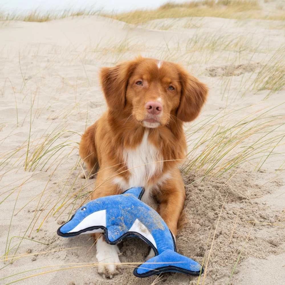 Een zacht pluche hondenspeelgoed in de vorm van een dolfijn dat goed is geschikt voor honden die graag knuffelen met een speeltje. De extra zachte vulling is gemaakt van 100% gerecyclede flessen.