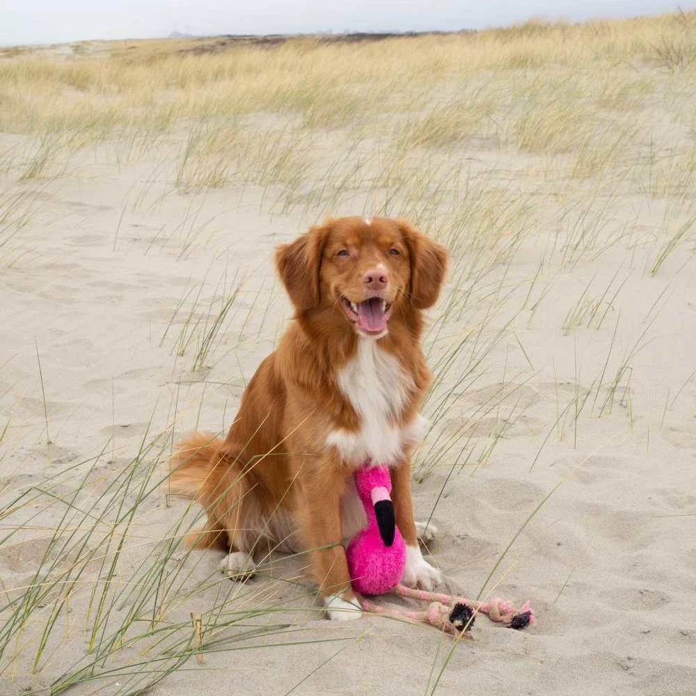 Een zacht pluche hondenspeelgoed in de vorm van een flamingo dat goed is geschikt voor honden die graag knuffelen met een speeltje. De extra zachte vulling is gemaakt van 100% gerecyclede flessen.