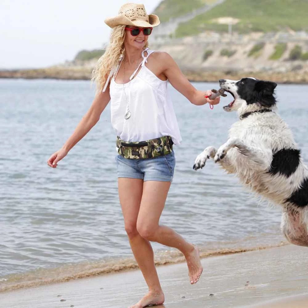 Deze bekroonde heuptas is ontworpen zodat u hands free met uw hond kunt wandelen. Het tasje draagt u om de heupen en is perfect geschikt om dagelijks te gebruiken. Door de twee karabijnhaken kunt u zelfs een kleine hond (max. 13 kg) aan het tasje vastmaken om bijvoorbeeld hands free te joggen.