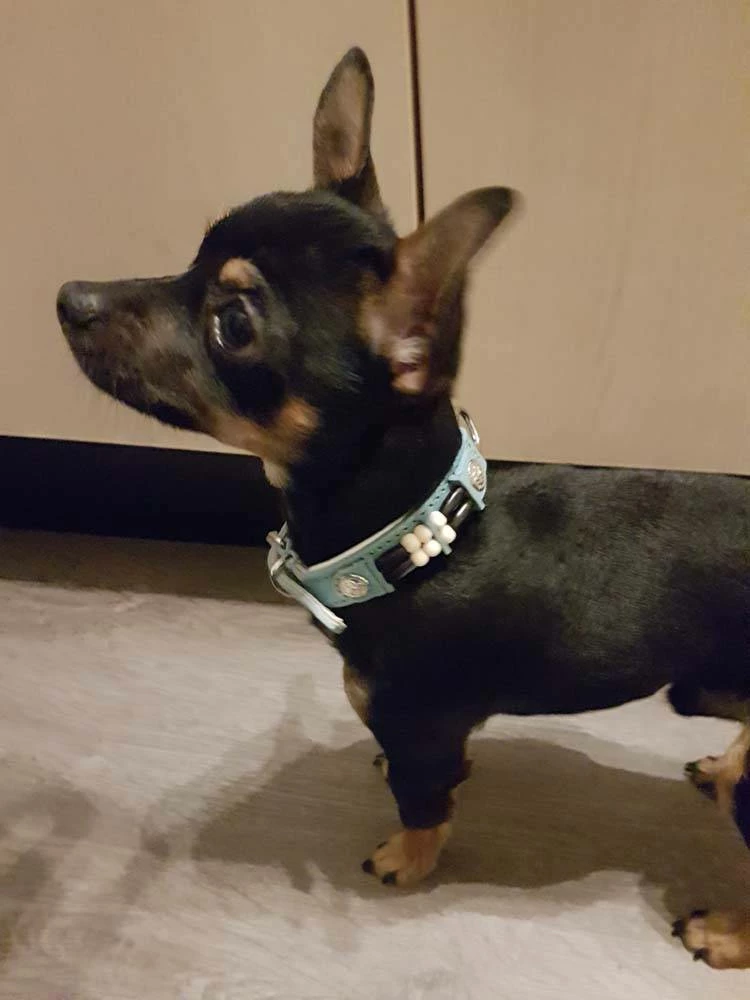 Deze mooie halsband is gemaakt van zacht dubbellaags leer. De halsban is uitgevoerd in een mooie baby blauwe kleur en is bijzonder geschikt voor de kleinere honden. De hondenhalsband is prachtig afgezet met witte, zwarte en zilverkleurige ornamenten. Voor extra comfort voor uw hond is de halsband gevoerd met zacht kalfsleer. De halsband is 15 mm breed.