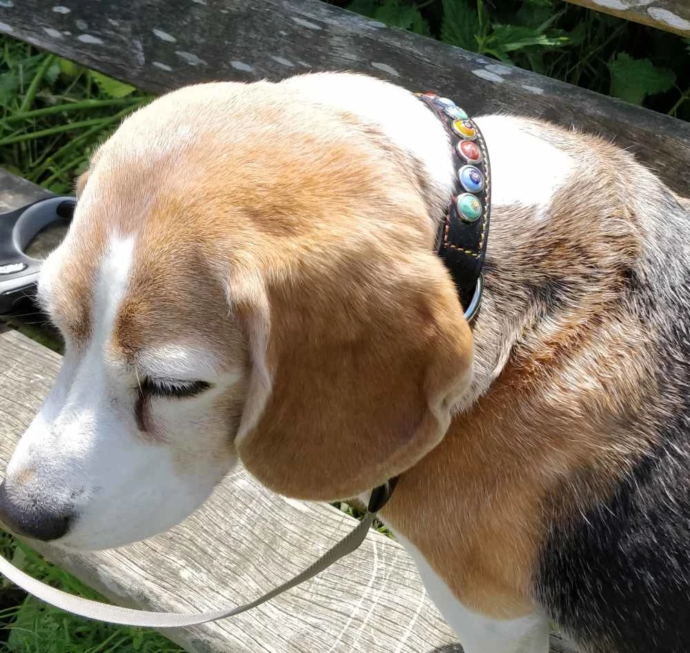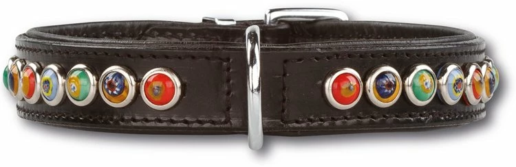 Deze halsband is gemaakt van zacht dubbellaags zwart leer. Het opvallende aan deze hondenhalsband zijn de decoraties van verschillende gekleurde ornamenten. Natuurlijk zal uw hond comfortabel deze halsband dragen want het is gevoerd met zacht kalfsleer.