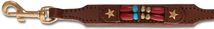 Deze stoere riem is gemaakt van bruin leer. De riem is afgezet met opvallende blauwe, rode en goudkleurige elementen, die prachtig contrasteren met het bruine leer.
