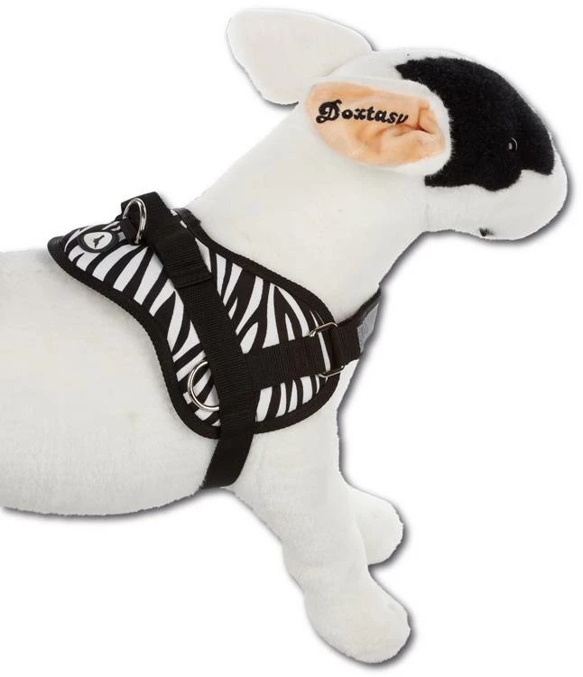 Een heel praktisch hondentuigje, in een vrolijke zebraprint, gemaakt van zeer stevig nylon. Ideaal als uw hond lekker buiten wilt spelen. De rugplaat is gevoerd. Bovenop het rugdeel bevindt zich de haak waar u de hond kunt aanlijnen, dus uw hond heeft geen direct contact met het metaal. Ook heeft het tuigje een handvat, handig als u de hond kort moet houden. Het tuigje is ruim verstelbaar. Aan de voorzijde is het hondentuigje voorzien van een reflecterende band voor extra zichtbaarheid. Op de buik heeft het harnasje een klik sluiting.