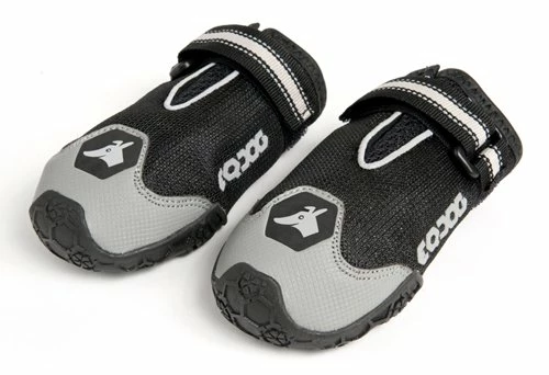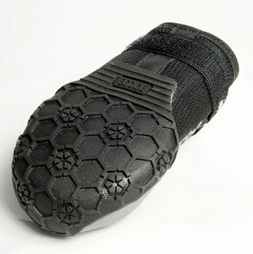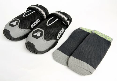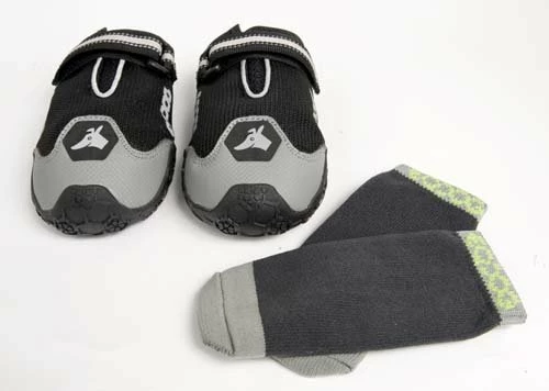 Een set van twee hondenschoenen, inclusief een paar sokken om de poten van de hond te beschermen. De hondenschoen is voorzien van zachte anti-slip zool met een rechthoekig patroon. Hierdoor kan de hond de schoenen op elk oppervlak dragen, zoals asfalt, rotsachtige paden of op een zoute of ijzige ondergrond.