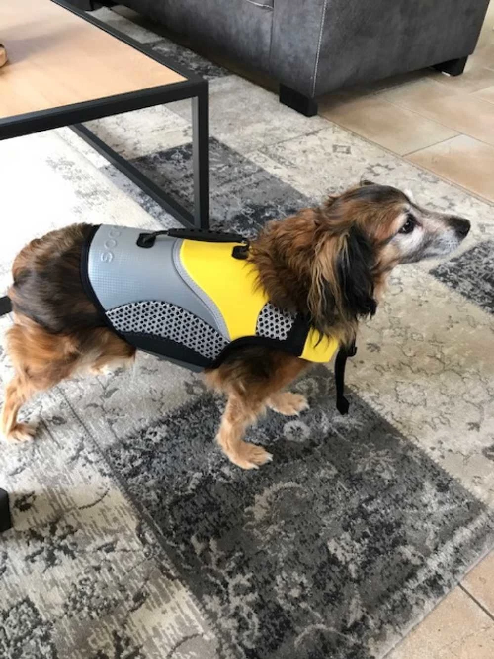 Het materiaal is high tech en slijt- en scheurbestendig. Bovendien heeft het hondenzwemvest door gebruik te maken van moderne technologie een lage weerstand in het water en een zeer hoog drijfvermogen. Ronde de hals is het zwemvest van flappen met een stevige klittenbandsluiting die speciaal zijn ontwikkeld zodat er geen haren van uw hond aan vast komen te zitten.