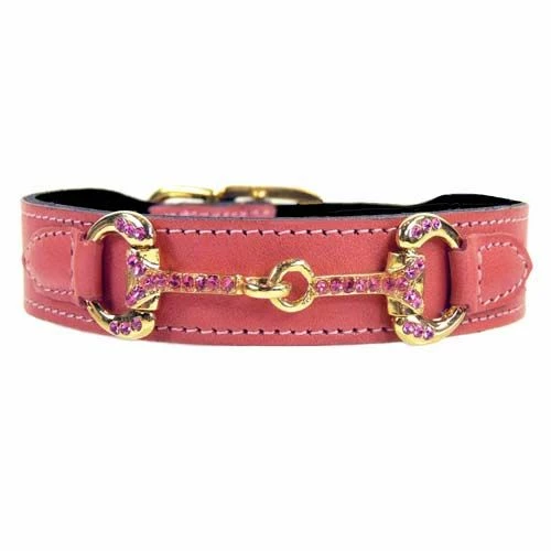 Een adembenemende roze leren hondenhalsband, die geheel met de hand wordt gemaakt van 100% Italiaans leer. De halsband is schitterend versierd met een decoratie in de vorm van een paarden bit, die is verguld met 22 karaats goud en is afgezet met originele roze Swarovski kristallen. Deze halsband is een hoogtepunt in de collectie van Hartman & Rose, die wereldwijd al veel aandacht heeft getrokken.