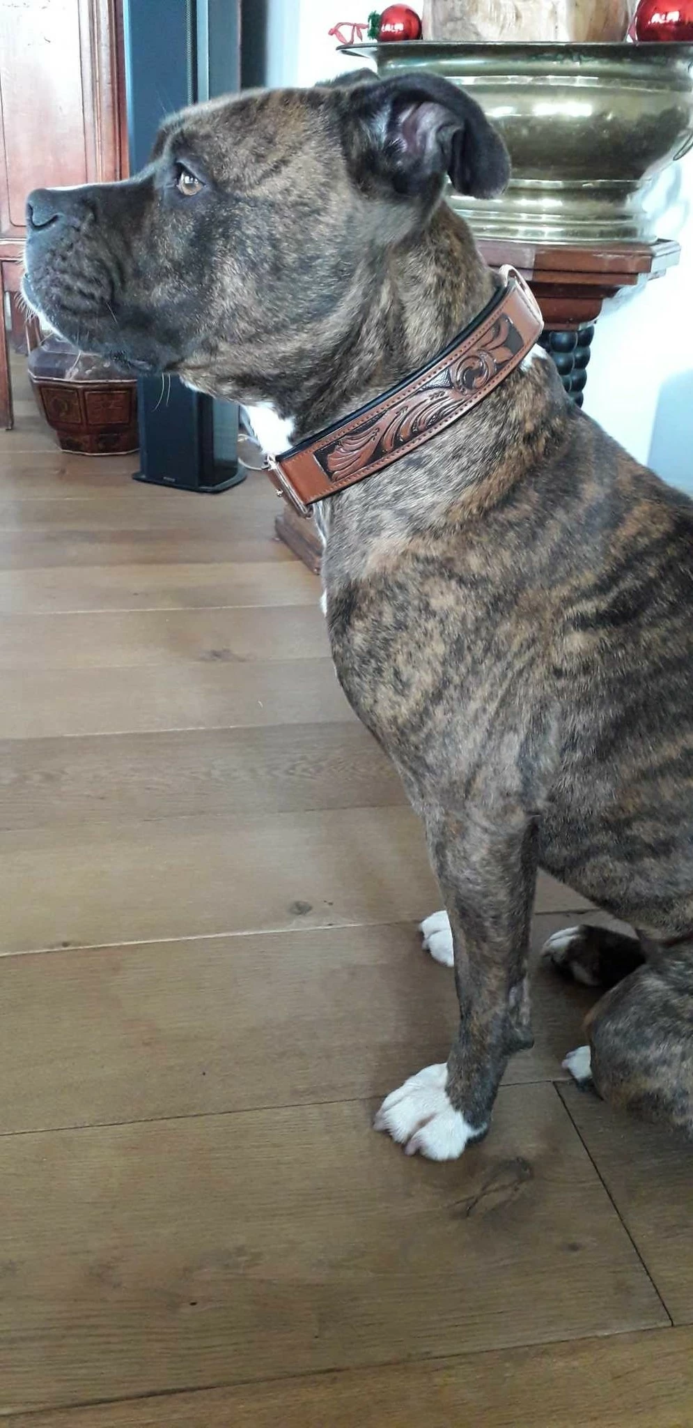 Als u op zoekt bent naar een prachtige leren hondenhalsband, dan is dit zeker een goede keuze. Deze halsband is met de hand gemaakt en genaaid van eersteklas kwaliteit zadelleer. De bovenzijde van deze hondenhalsband is uitgevoerd in een cognac kleur met fraaie decoraties die met de hand zijn ingekerfd.