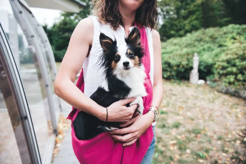 De hond ligt in de tas alsof het een gezellige hangmat is. Omdat u de hond zo dicht bij uw lichaam draagt, voelt uw hond zich veilig en kalm. Deze nabijheid tot hun baasje is vooral voor puppy’s erg belangrijk.