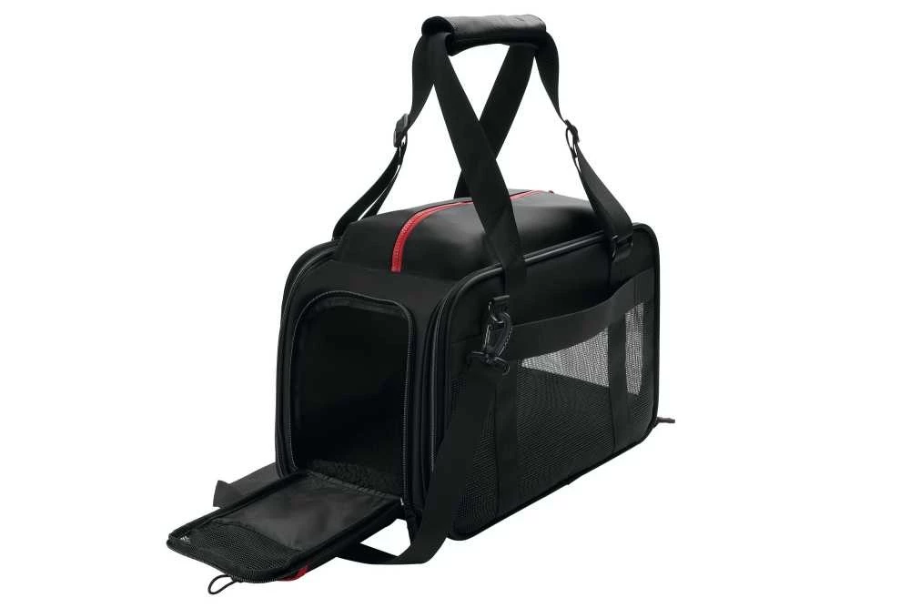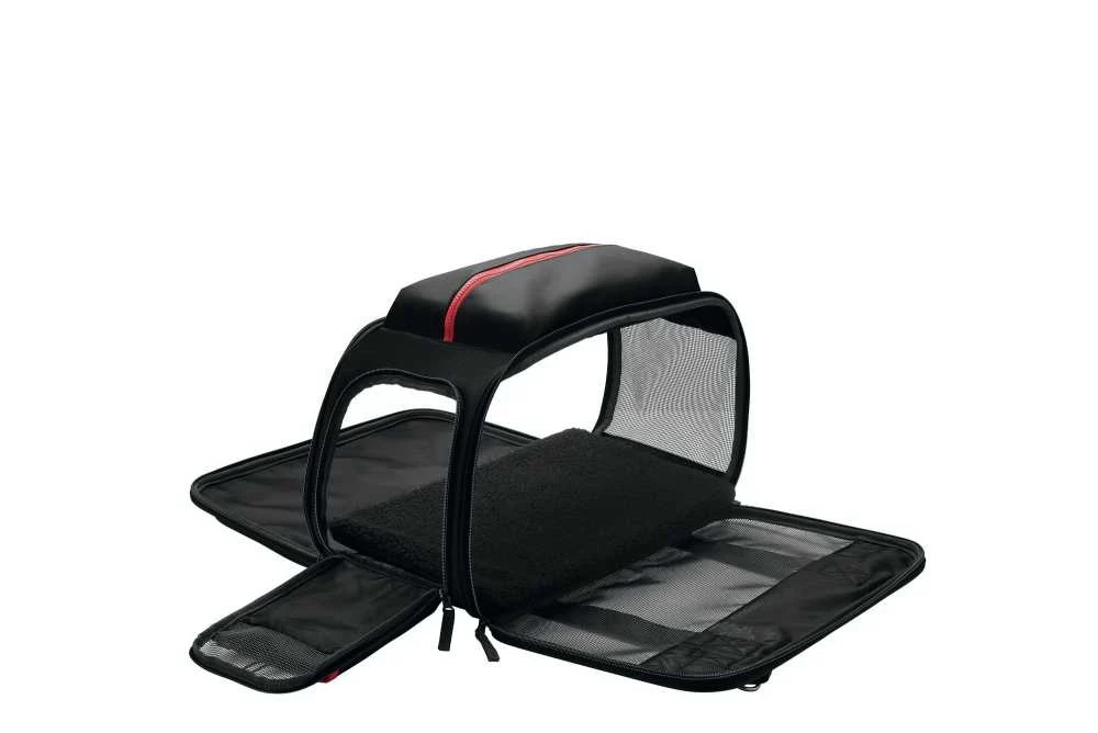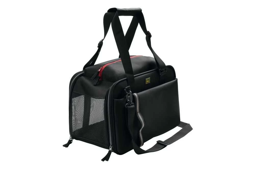 Met deze handige zwarte draagtas van robuust en waterafstotend nylon materiaal maakt u een uitstekende keuze. Binnenin de tas voelt uw trouwe viervoeter zich heerlijk op zijn gemak, mede dankzij het zachte ligvlak van imitatie lamsleer. Frisse lucht is er dankzij de ventilatieroosters en de royale buitenvakken bieden ruimte voor je spullen zoals sleutels en smartphone. De hondendraagtas wordt zowel nonchalant over de schouder als in de hand gedragen.