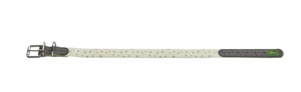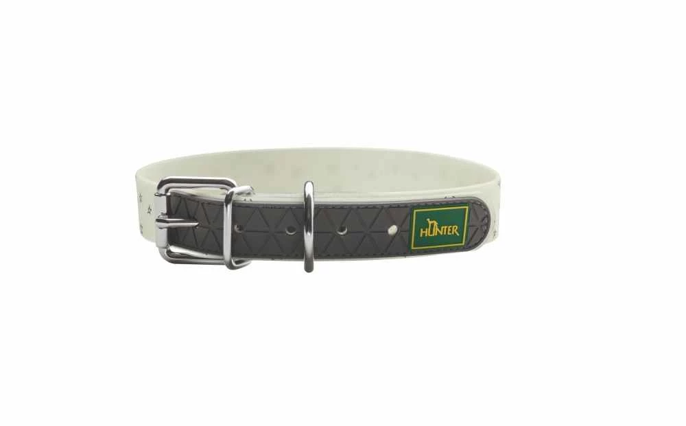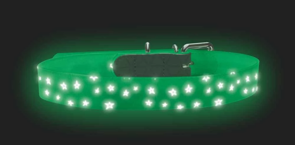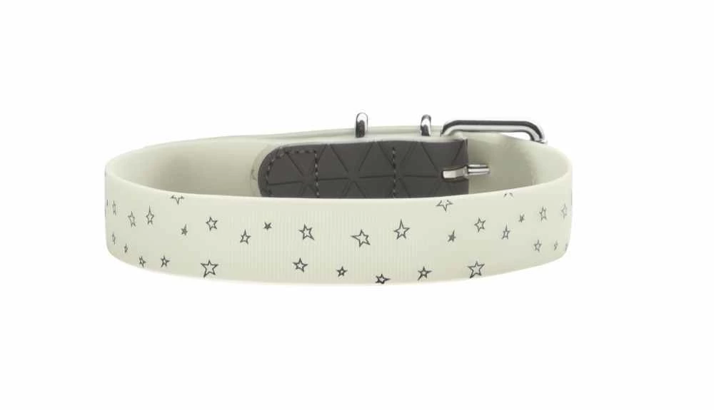 Deze chique witte halsband valt op door de print met sterretjes. Het lichte materiaal licht op in het donker én reflecteert de koplampen van auto’s, fietsen etc. Dit betekent dat baasjes en hun honden goed te zien zijn, zelfs bij slecht zicht en op grote afstand. De halsband is gemaakt van innovatief en bijzonder robuust kunststof. Hierdoor hoeft het nauwelijks onderhouden te worden. Als de halsband nat en vuil wordt door een duik in koud water of een lang modderbad, kan hij binnen enkele seconden worden afgewassen en gedroogd. Meer zorg? Niet nodig.