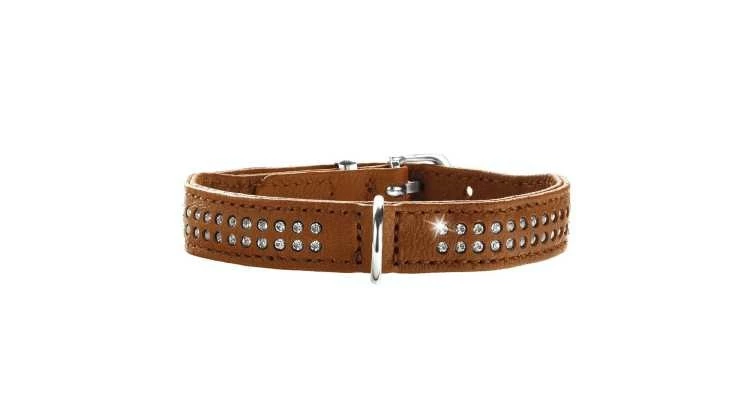 Deze opvallende halsband is een gemaakt van Scandinavisch elandleer. Dit zeldzame leer is bekend omdat het leer zeer zacht en warm is. De halsband is ontworpen voor de kleinere hondenrassen. De hondjes zullen zeker opvallen door de rijen stras steentjes die van de halsband een echte blikvanger maken.
