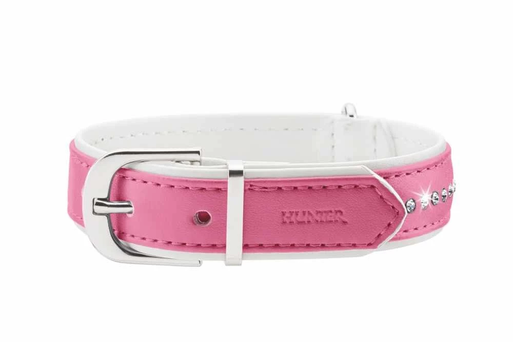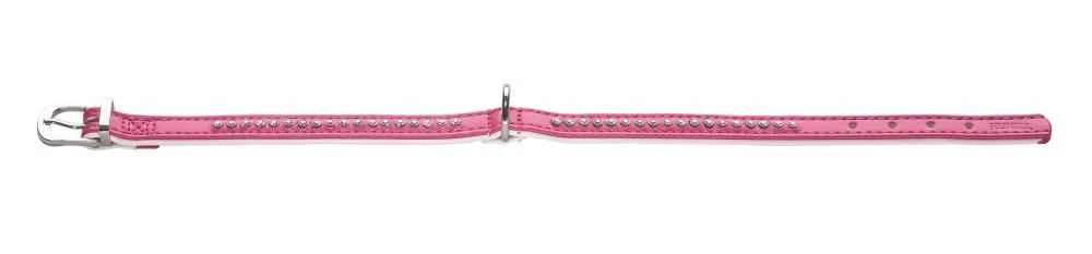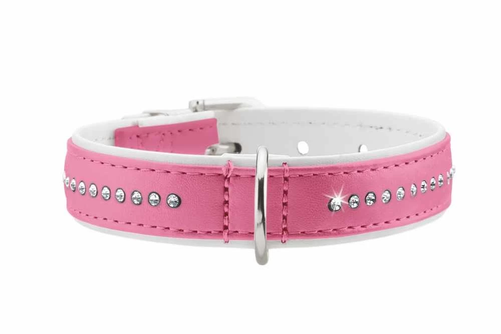 Deze halsband is perfect geschikt om een ​​vleugje glamour in het dagelijks leven te brengen – zowel voor u als voor uw hond. In de halsband van zacht imitatieleer zijn stras steentjes gezet, waardoor de hondenhalsband zelfs bij het geringste zonnestraaltje opwindend glinstert. Dankzij het soepele kunstleer is de halsband zeer comfortabel en gemakkelijk aan te trekken. De halsband heeft een extra kleine D ring en gesp.