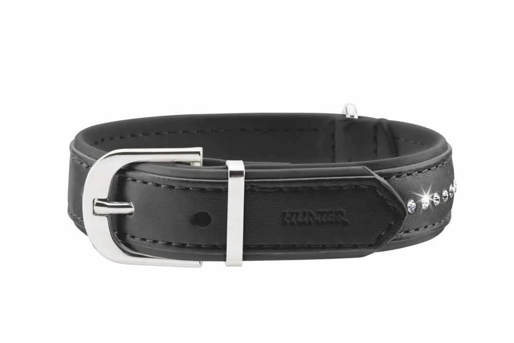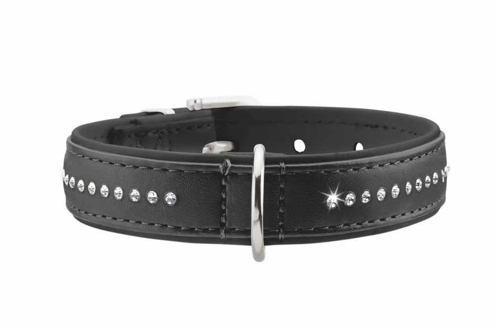 Deze halsband is perfect geschikt om een ​​vleugje glamour in het dagelijks leven te brengen – zowel voor u als voor uw hond. In de halsband van zacht imitatieleer zijn stras steentjes gezet, waardoor de hondenhalsband zelfs bij het geringste zonnestraaltje opwindend glinstert. Dankzij het soepele kunstleer is de halsband zeer comfortabel en gemakkelijk aan te trekken. De halsband heeft een extra kleine D ring en gesp.