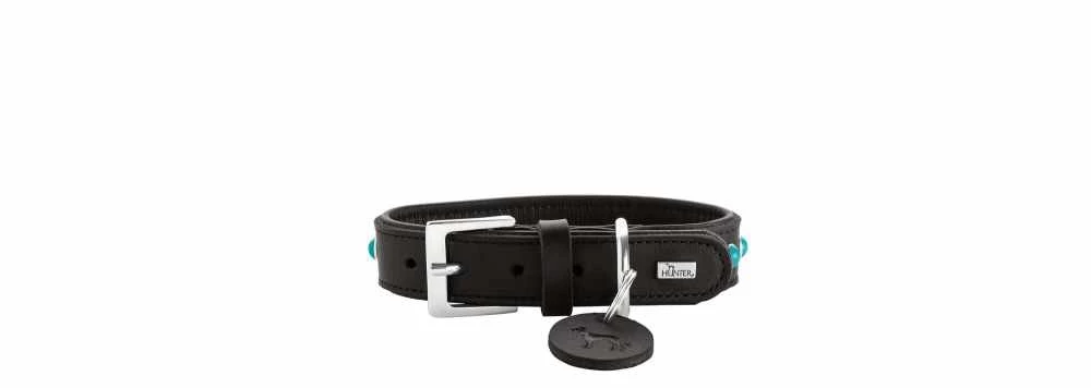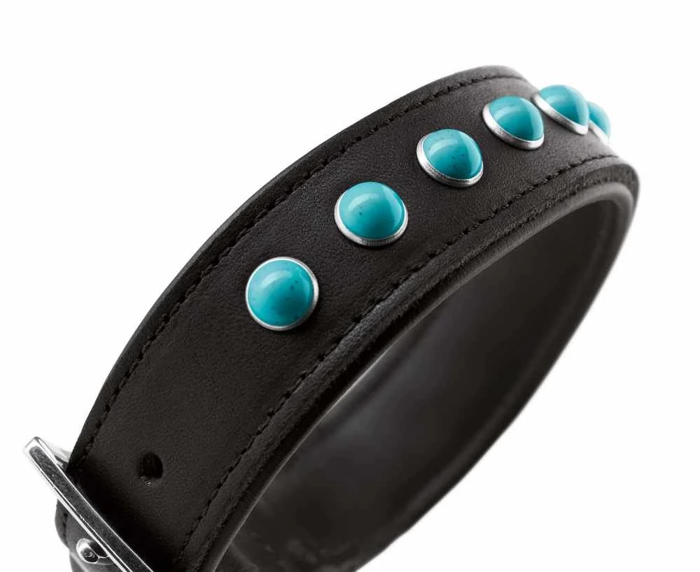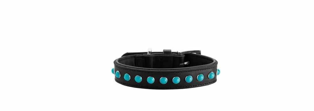 Deze halsband is een echte blikvanger ! Het veerkrachtige en slijtvaste rundleer is gevoerd met een zachte laag nappaleer. Door de gebogen verwerking van de voering is de halsband onvergelijkbaar zacht en ook erg zacht voor de vacht van de hond. Een pluspunt voor gevoelige viervoeters die niet zonder maximaal comfort willen. De bovenkant van de halsband, die geschikt is voor dagelijks gebruik, is versierd met turquoise edelstenen.Â