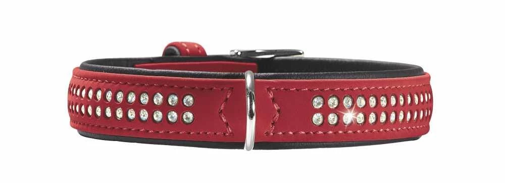 Deze halsband is gemaakt van zeer zacht kunstleer en is door de strakke vorm en de grote keuze aan kleuren geschikt voor elke smaak. Het onderhoudsvriendelijke imitatieleer maakt deze mooie halsband absoluut geschikt voor dagelijks gebruik. De hoogwaardige afwerking en het soepele materiaal maken de halsband knuffelig en comfortabel. Deze halsband is luxe gedecoreerd met strass steentjes. De gekleurde uitvoeringen van de halsband hebben een contrasterende zwarte binnenkant. De hondenhalsband is zeer comfortabel voor de hond.