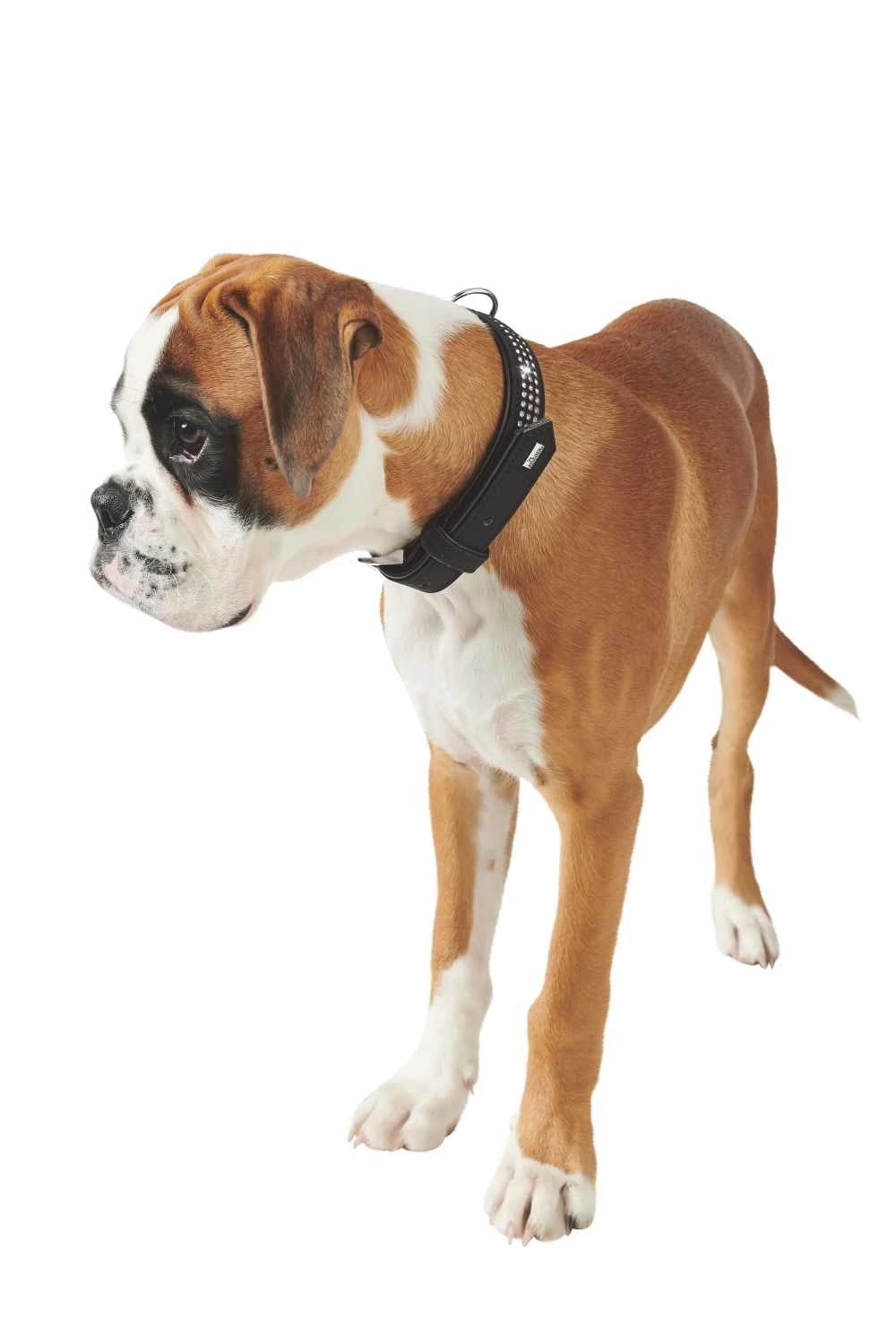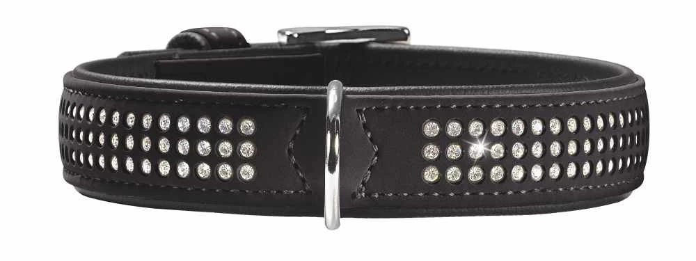 Deze halsband is gemaakt van zeer zacht kunstleer en is door de strakke vorm en de grote keuze aan kleuren geschikt voor elke smaak. Het onderhoudsvriendelijke imitatieleer maakt deze mooie halsband absoluut geschikt voor dagelijks gebruik. De hoogwaardige afwerking en het soepele materiaal maken de halsband knuffelig en comfortabel. Deze halsband is luxe gedecoreerd met drie rijen strass steentjes. De gekleurde uitvoeringen van de halsband hebben een contrasterende zwarte binnenkant. De hondenhalsband is zeer comfortabel voor de hond.