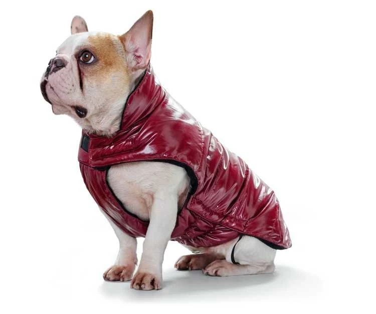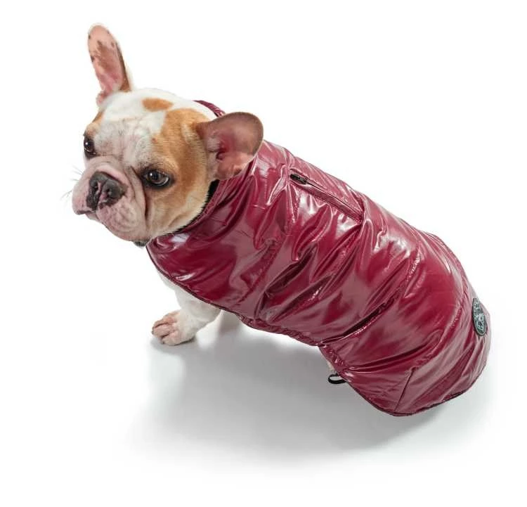 Een modieuze touch krijgt de hondenjas door het glanzende uiterlijk.