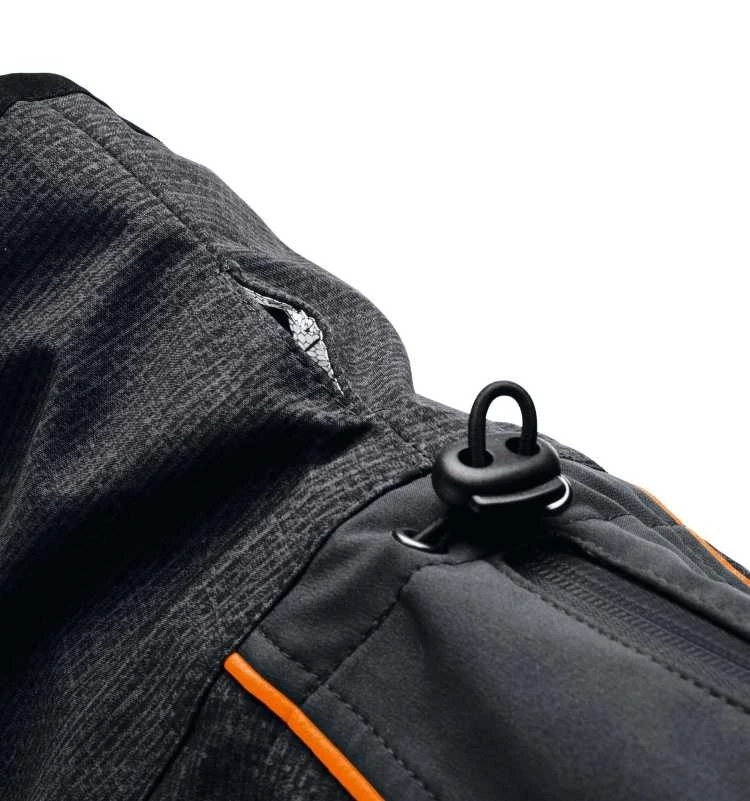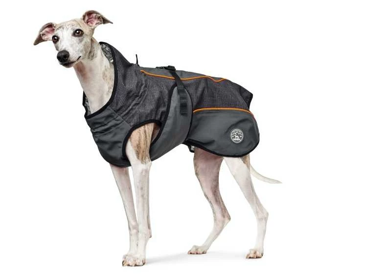 Deze comfortabele antraciete hondenjas is ideaal voor regenachtige en koele dagen. De polyester hondenjas is waterafstotend, winddicht en lichtgewicht. Het jasje is gevoerd met thermische folie dat de lichaamswarmte van de hond terug reflecteert. Hierdoor blijft de hond ook op koude dagen warm. De elastische bevestigingsbanden voor de achterpoten (variabel in positie en lengte) zorgen voor een perfecte pasvorm, ongeacht de lichaamsbouw van uw hond. De nek van de hondenjas is in de breedte verstelbaar door middel van een elastische band en heeft een opening voor de D-ring van een halsband. Op de rug is er een ritssluiting zodat de hond ook een tuigje kan dragen.