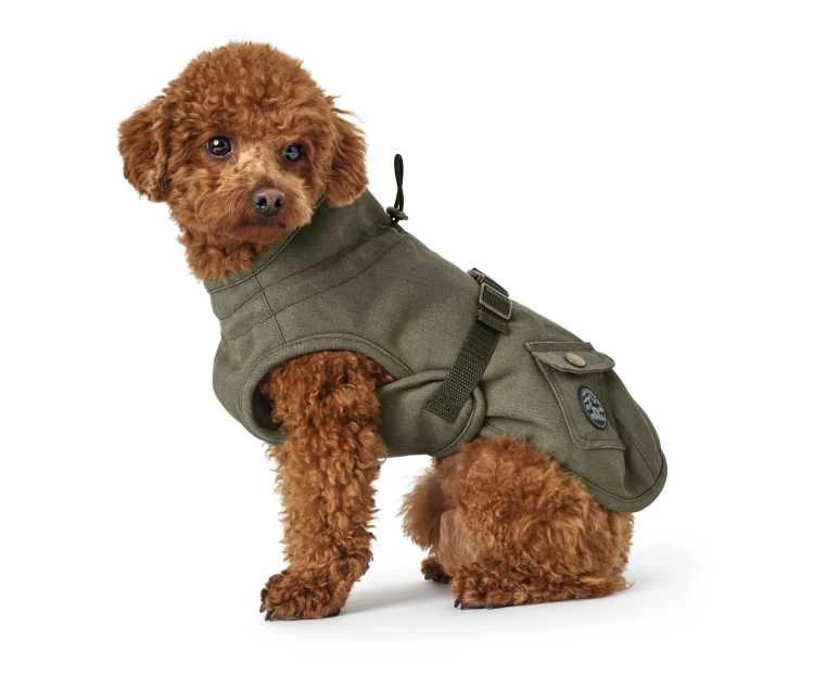 Dit is een robuuste en modieuze hondenjas in een parka look. De jas is gemaakt van katoen. Het jasje is gevoerd met zacht imitatie lamsbont dat de hond aangenaam warm houdt. De elastische bevestigingsbanden voor de achterpoten (variabel in positie en lengte) zorgen voor een perfecte pasvorm, ongeacht de lichaamsbouw van uw hond. De nek van de hondenjas is in de breedte verstelbaar door middel van een elastische band en heeft een opening voor de D-ring van een halsband.