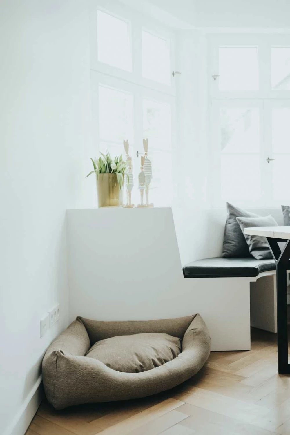 Dit is een mooie en elegante beige hondenmand. De mand is een hoekmodel. De mand is voorzien van een los hondenkussen. De hondenmand biedt uw hond een bijzonder comfortabele rustplaats.