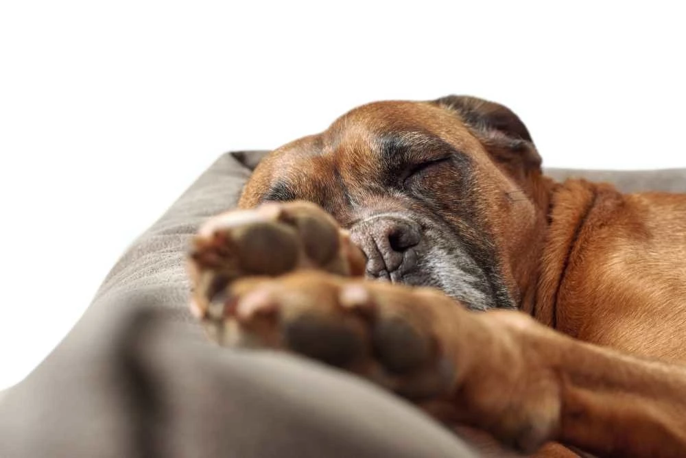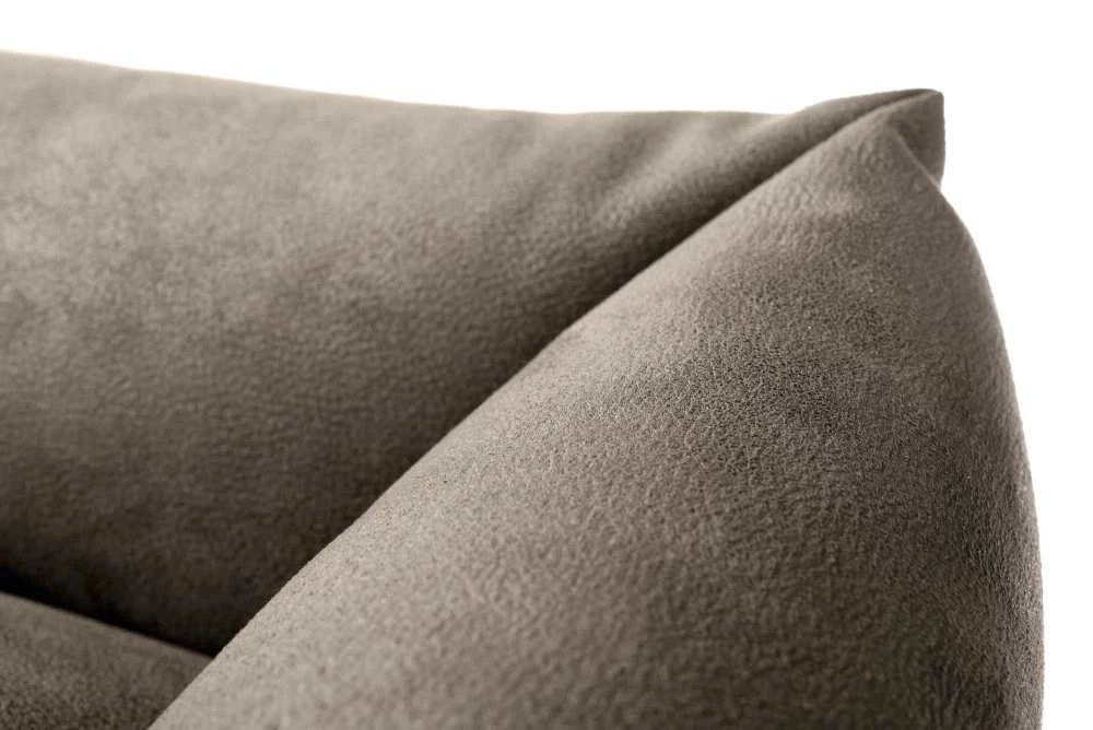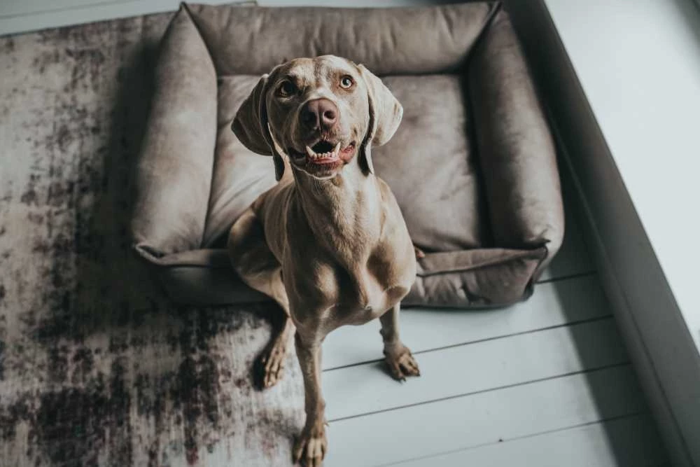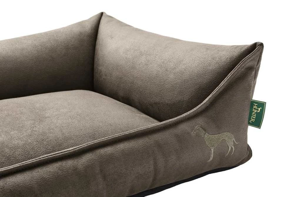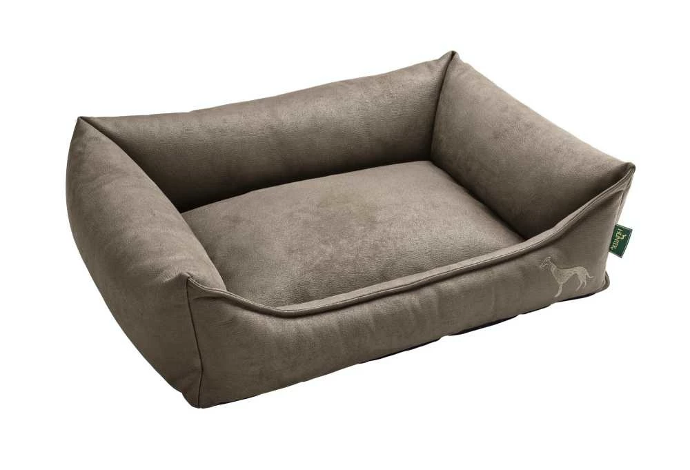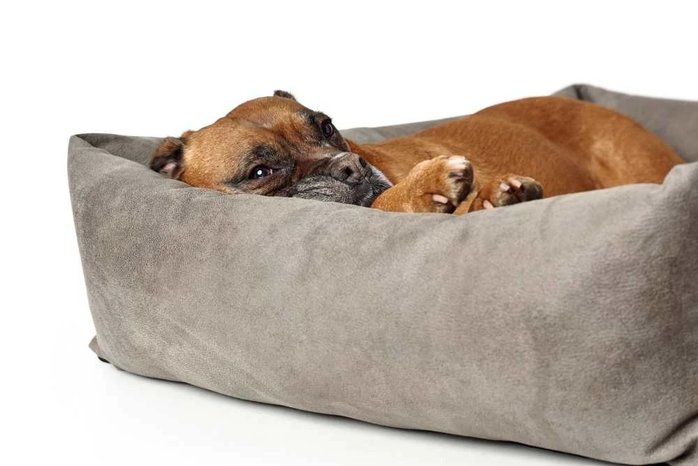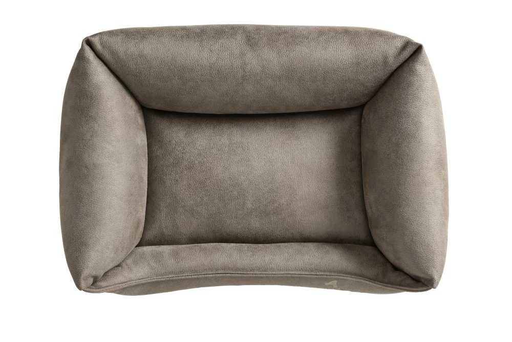 Een stijlvolle bruine kunstleren hondenmand die goed geschikt is voor honden die graag tegen een rand aan liggen.