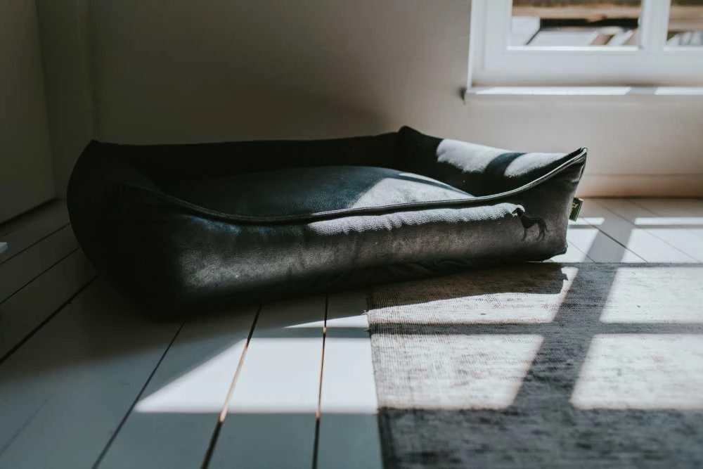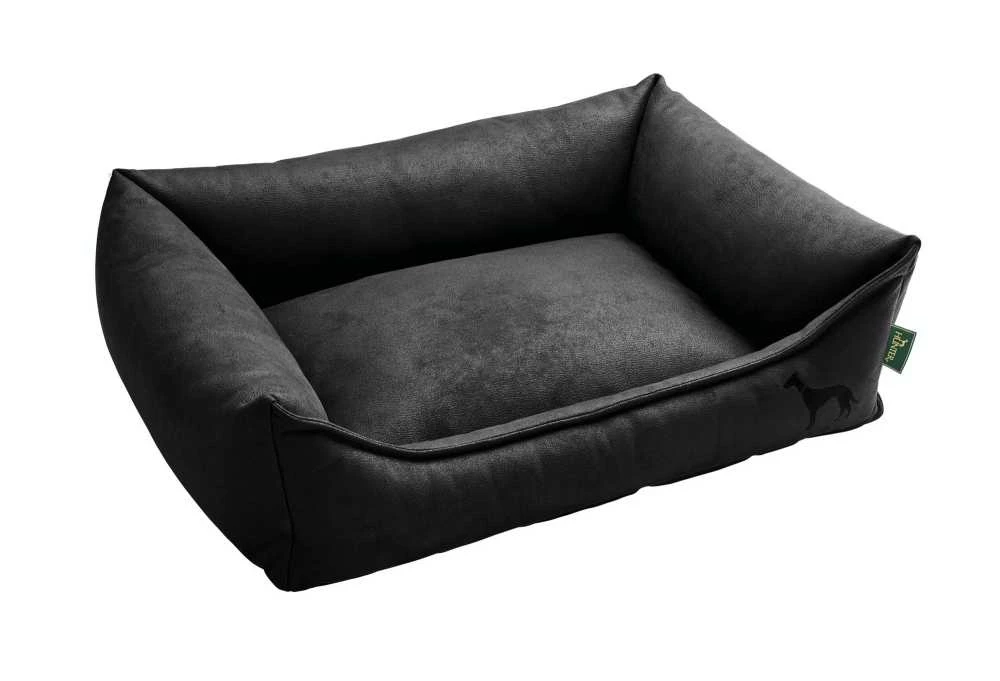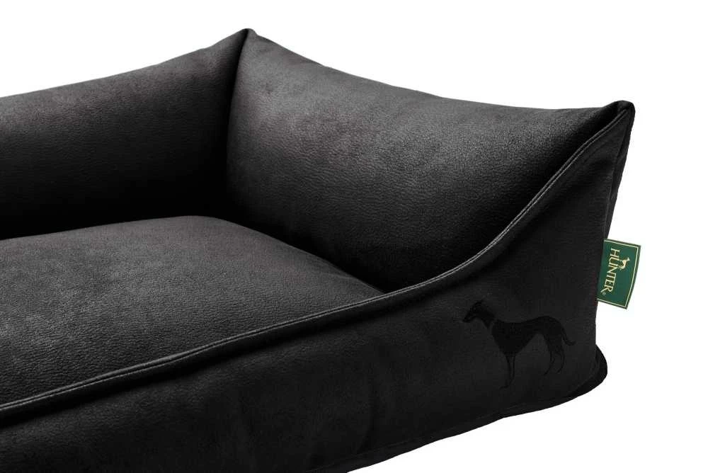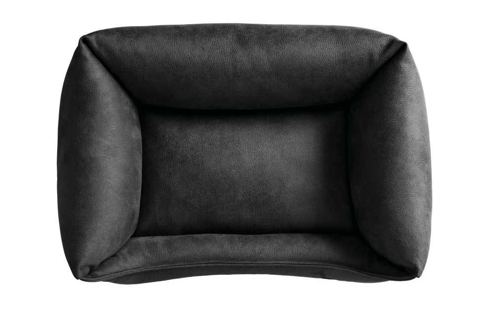 Een stijlvolle zwarte kunstleren hondenmand die goed geschikt is voor honden die graag tegen een rand aan liggen.