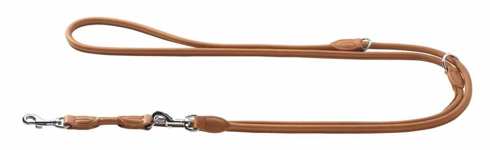 Deze cognac hondenriem is gemaakt van dubbellaags leer en kan drievoudig worden versteld. Dankzij een nylon kern in het afgeronde elandleer, is de riem ondanks zijn delicate en lichtgewicht ontwerp zeer stevig.