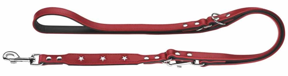 Deze schitterende hondenriem is gemaakt van zacht rundleer. De decoratie met sterren wordt individueel gestikt en deze zijn extra verstevigd. De riem kan drievoudig worden versteld.