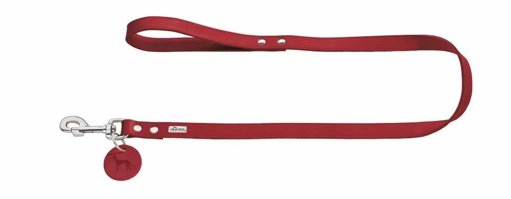 Deze rode hondenriem is gemaakt van rundleer. Dankzij een royale toevoeging van olie en een natuurlijk verfproces, is de riem ook bestand tegen zware belasting. Hierdoor is deze hondenriem ook goed geschikt is voor hondensporten. De riem heeft een handvat en een musketonhaak.
