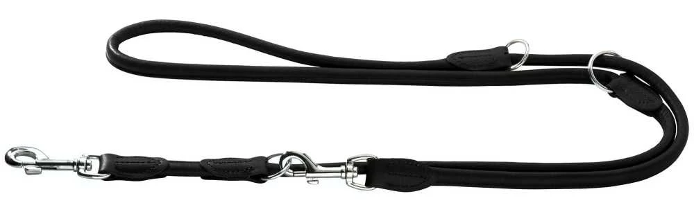 Deze zwarte hondenriem is gemaakt van dubbellaags leer en kan drievoudig worden versteld. Dankzij een nylon kern in het afgeronde elandleer, is de riem ondanks zijn delicate en lichtgewicht ontwerp zeer stevig.
