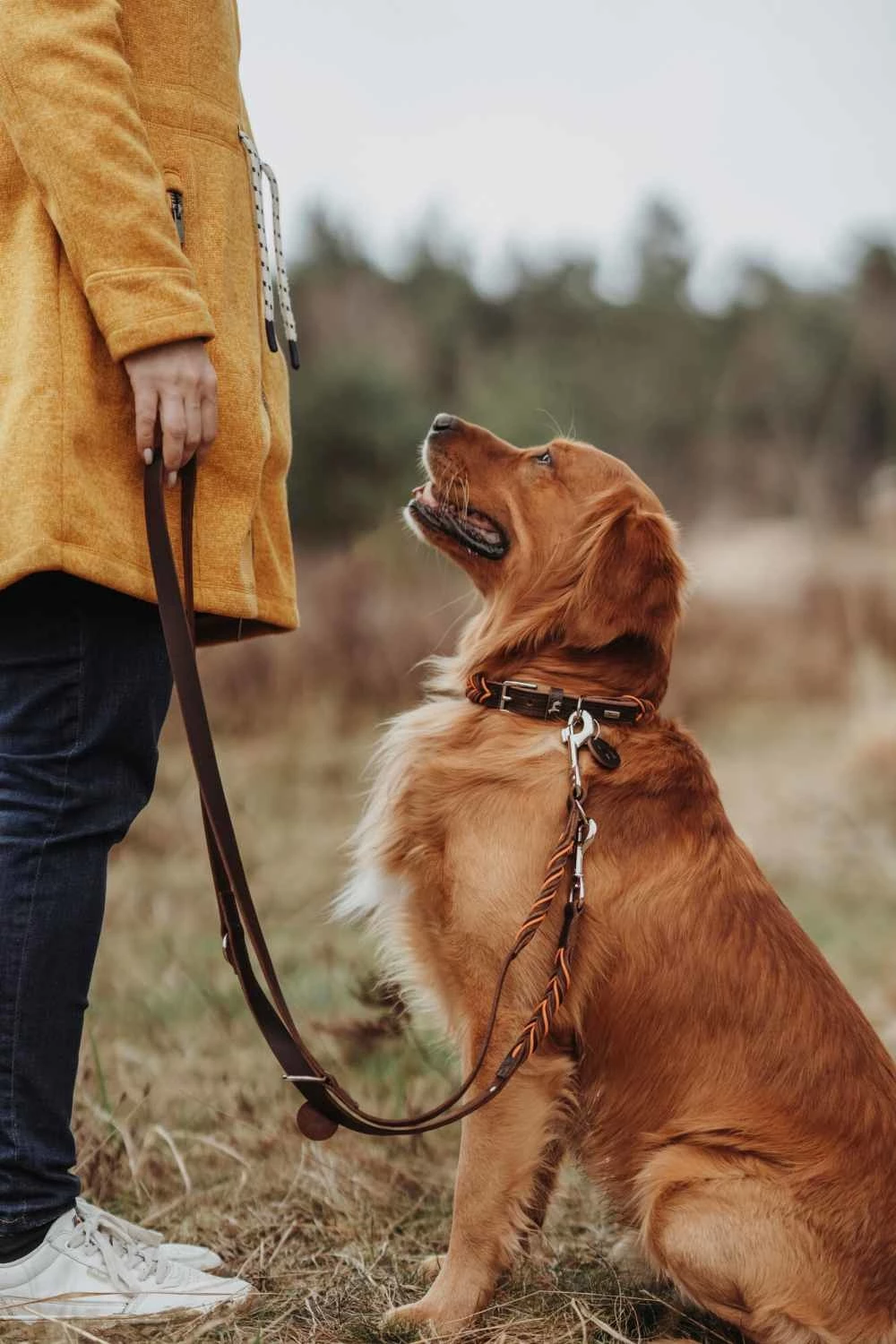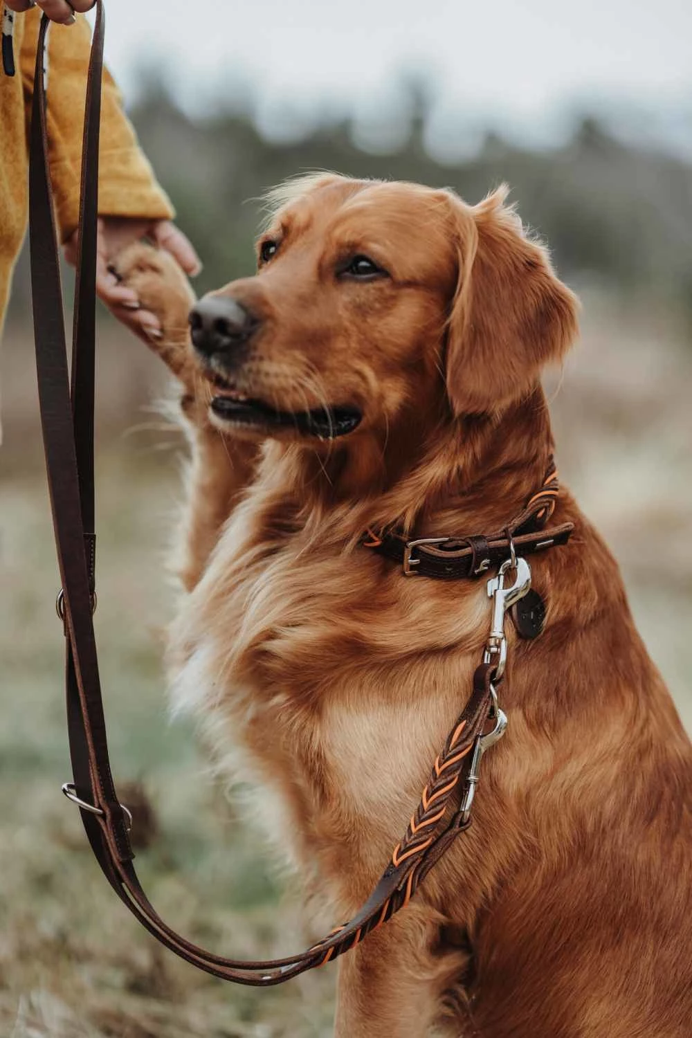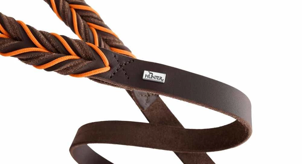 Een aangename wandeling begint met de keuze van de perfecte combinatie van halsband of harnas en hondenriem. Bij deze fraaie handgemaakte en verstelbare hondenriem ​​is gekozen voor rundleer met opvallend oranje gevlochten polyester touw.
