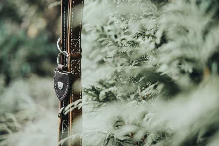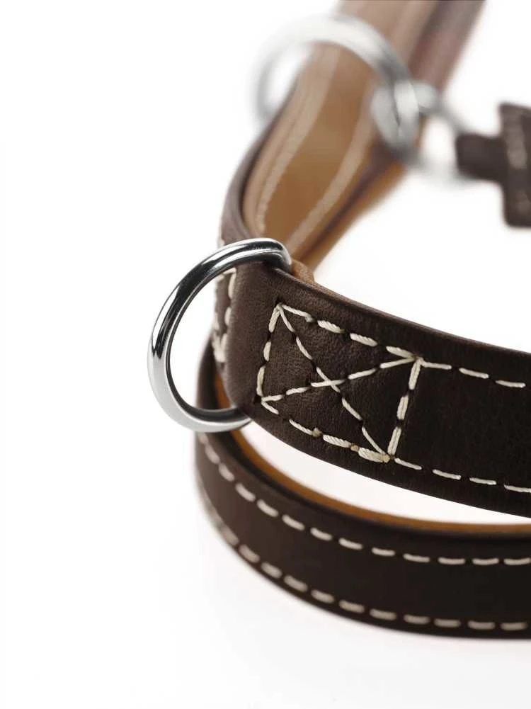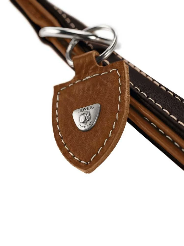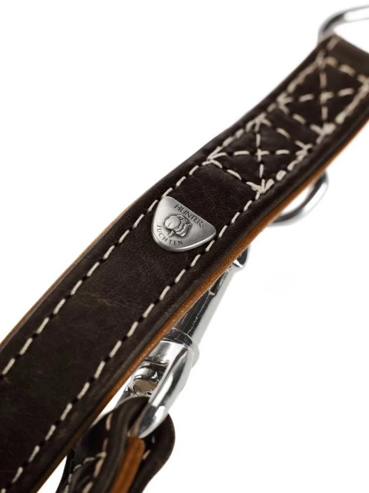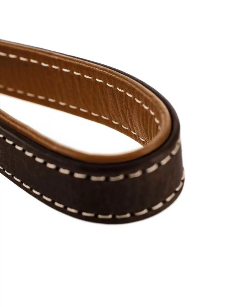 Een mooi detail zijn de contrasterende stiksels. Deze hondenriem is uitgevoerd met een bruine kleur aan de buitenzijde en is gevoerd met cognac leer. De hondenriem is voorzien vaan twee karabijnhaken, en u kunt de riem drievoudig verstellen.
