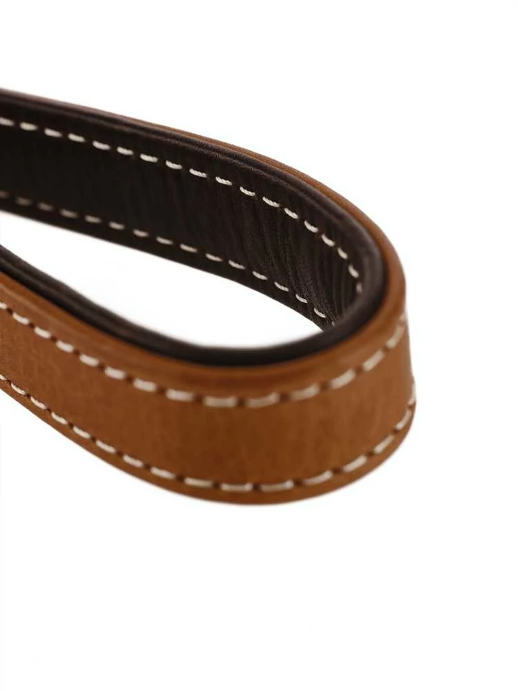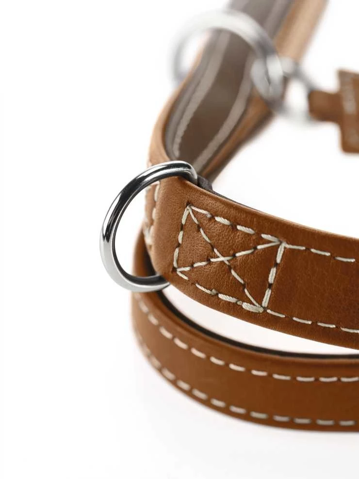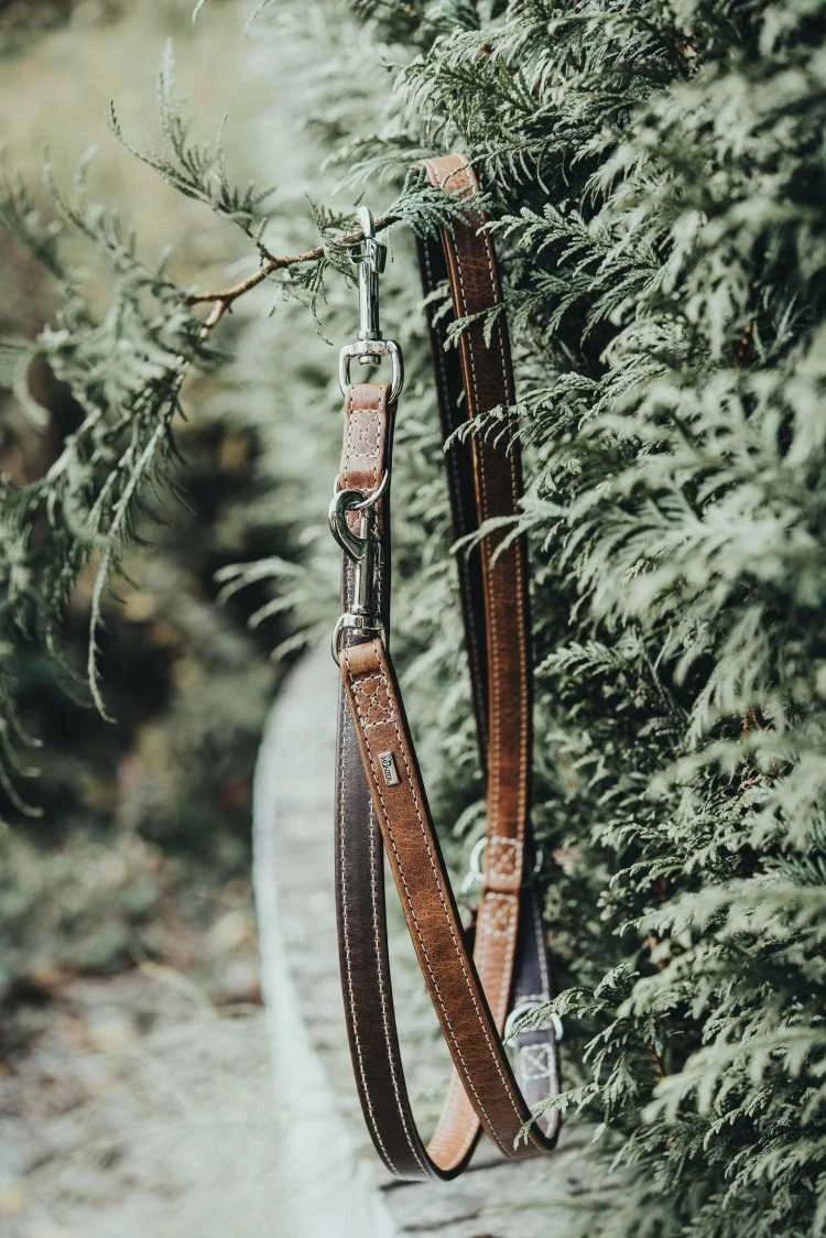 Een mooi detail zijn de contrasterende stiksels. Deze hondenriem is uitgevoerd met een cognac kleur aan de buitenzijde en is gevoerd met donkerbruin leer. De hondenriem is voorzien vaan twee karabijnhaken, en u kunt de riem drievoudig verstellen.