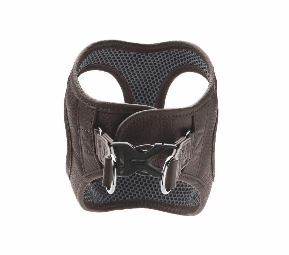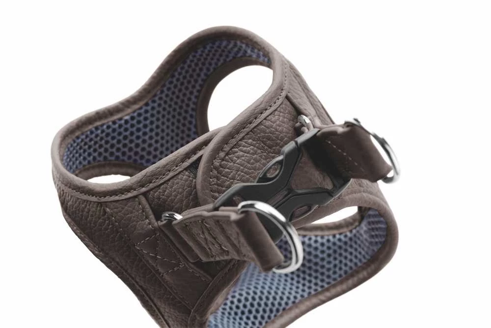 Dit is een modern en innovatief bruin hondentuig. Het hondentuig is gemaakt van zacht leer en is gevoerd met ademend mesh materiaal.