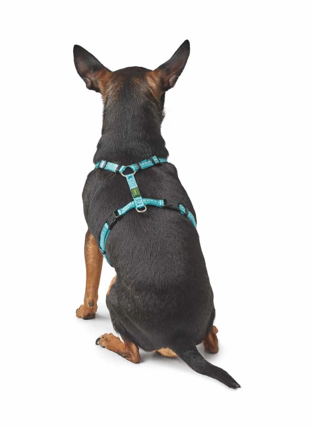 Een hip en trendy hondentuig voor puppy’s en kleinere honden dat is uitgevoerd in blauw nylon. Het tuig heeft speciale reflecterende strips, die in het robuuste en weerbestendige nylon materiaal zijn verwerkt. Deze strips reflecteren het licht in regenboogkleuren. Het tuig is traploos verstelbaar.