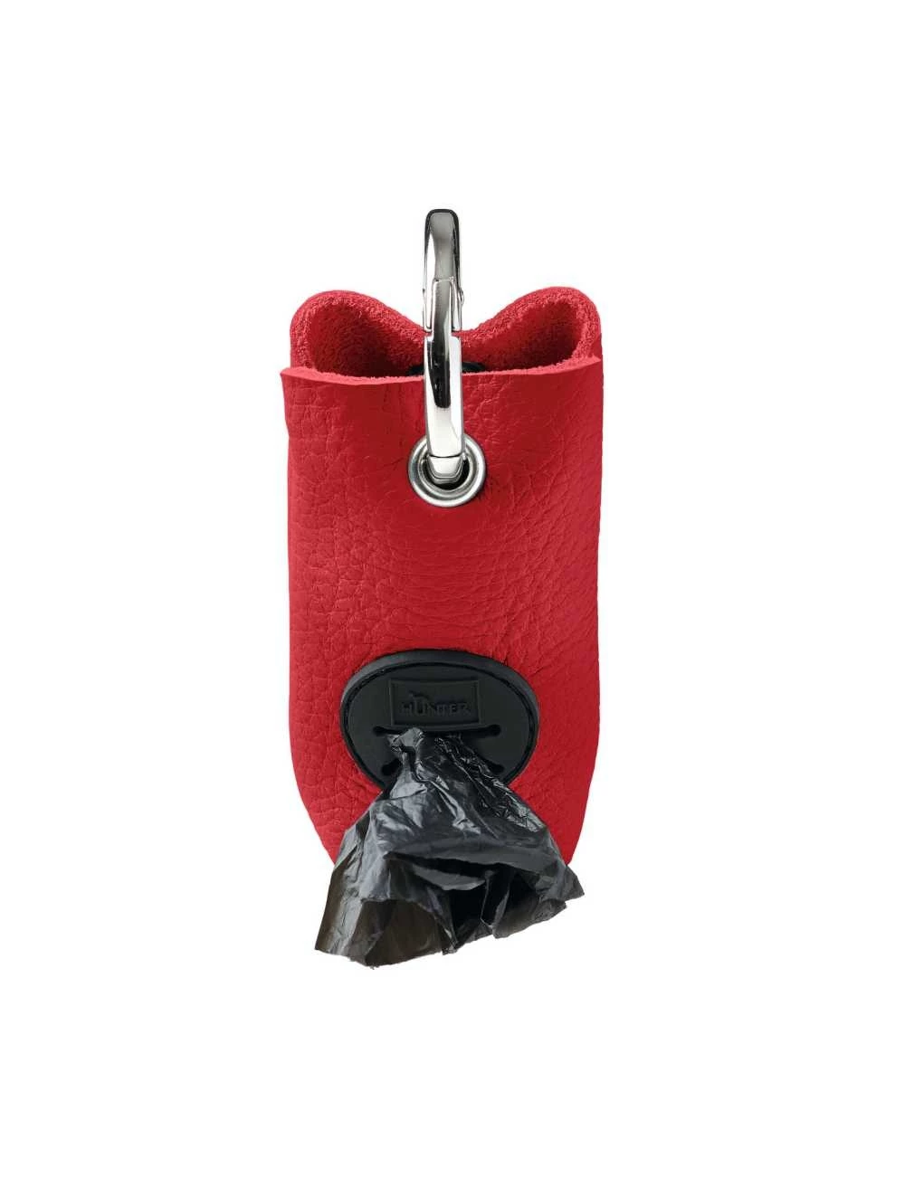 De poepzakhouder is gemaakt van roze leer en wordt geleverd inclusief een rol poepzakjes.