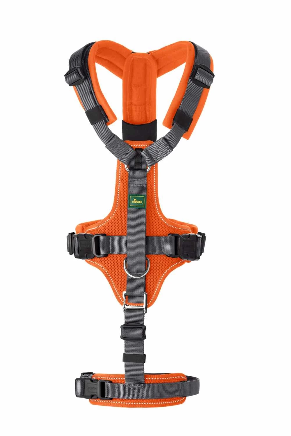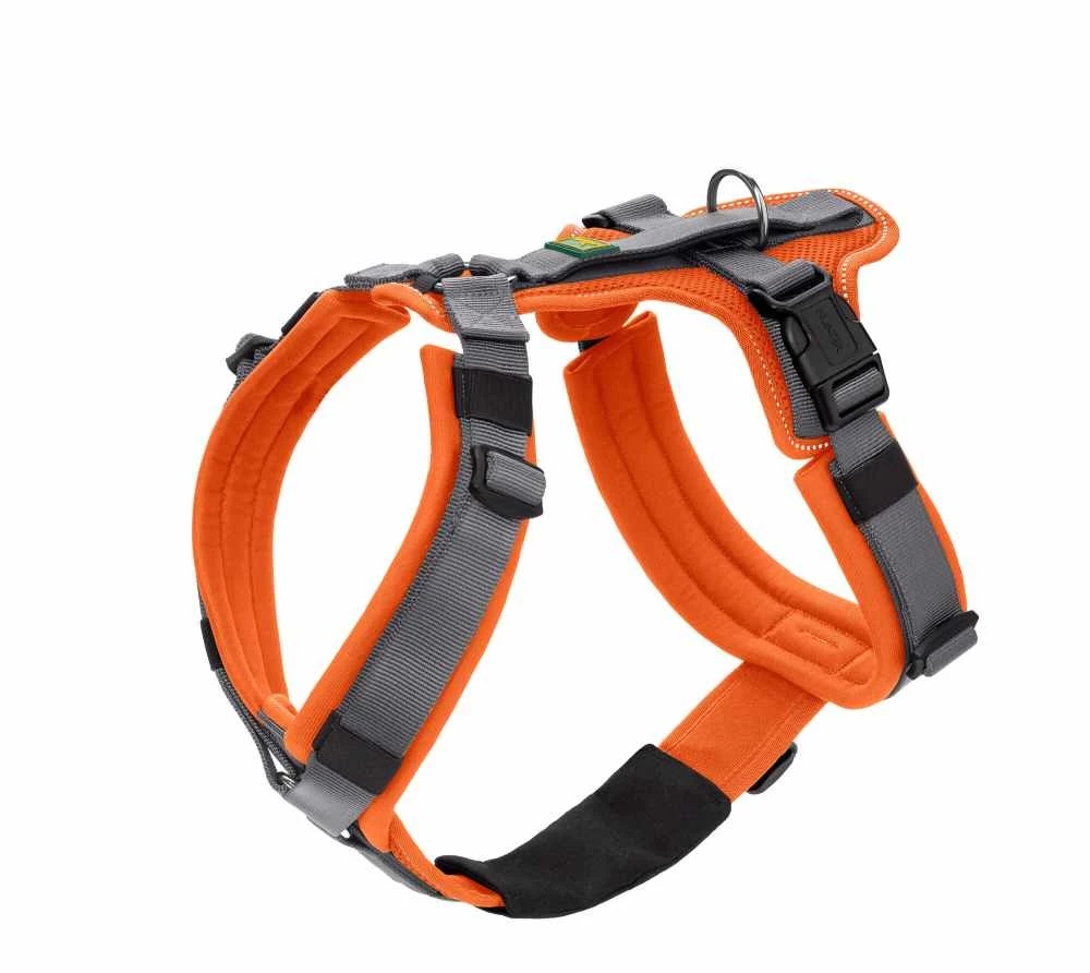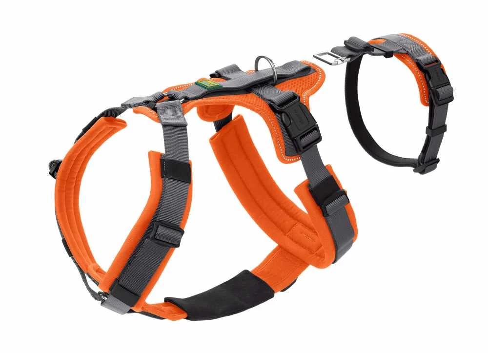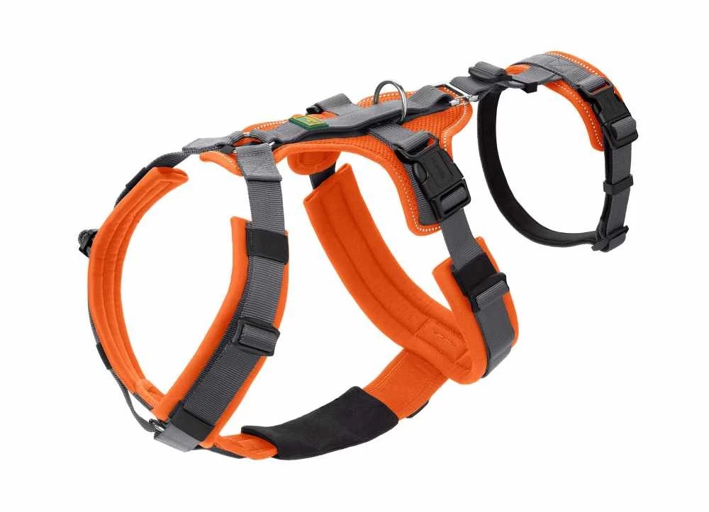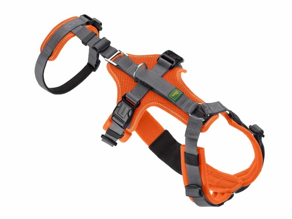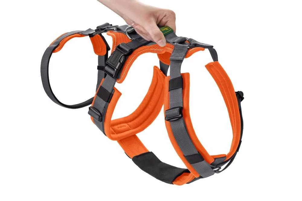 Het veiligheidsharnas heeft als extra’s allereerst een handvat aan de achterzijde (vanaf maat S-M) waarmee de hond in een gevaarlijke situatie snel en veilig kan worden vastgehouden. Daarnaast is het voorzien van de extra buikband. Deze kan individueel worden aangepast voorkomt dat de hond “naar achteren ontsnapt” en uit het tuig “loskomt”.