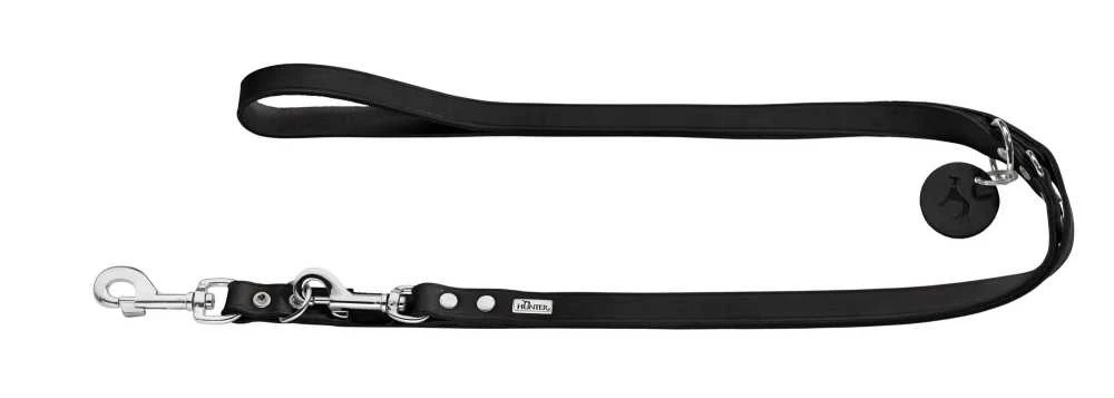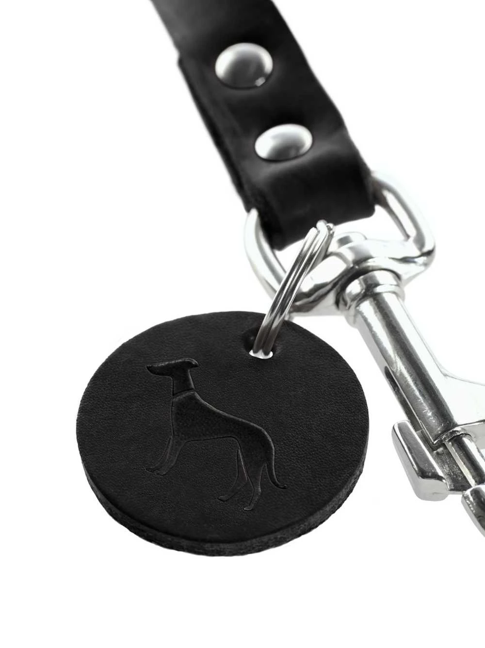 Een zachte zwarte leren hondenriem, die is gemaakt van zacht koeienleer. De riem heeft een leuk en afneembaar hangertje, een handvat en is drievoudig verstelbaar.