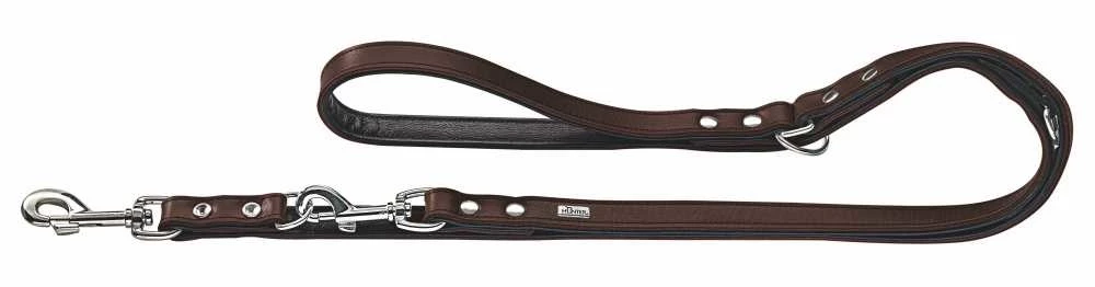 Een sterke en soepele leren hondenriem, in een functioneel ontwerp met oog voor detail. De riem is gevoerd, zodat het handvat comfortabel in de hand ligt. De twee musketonhaken zijn gemaakt van nikkel. De hondenriem is drievoudig verstelbaar.