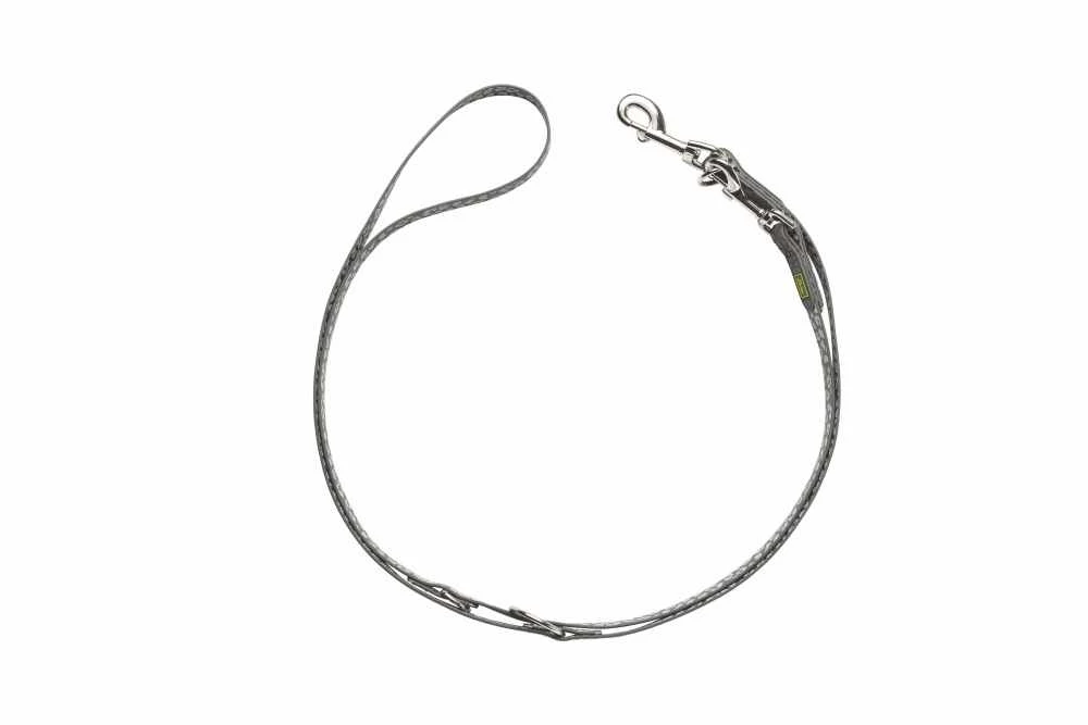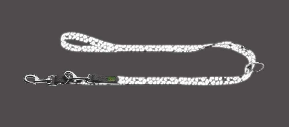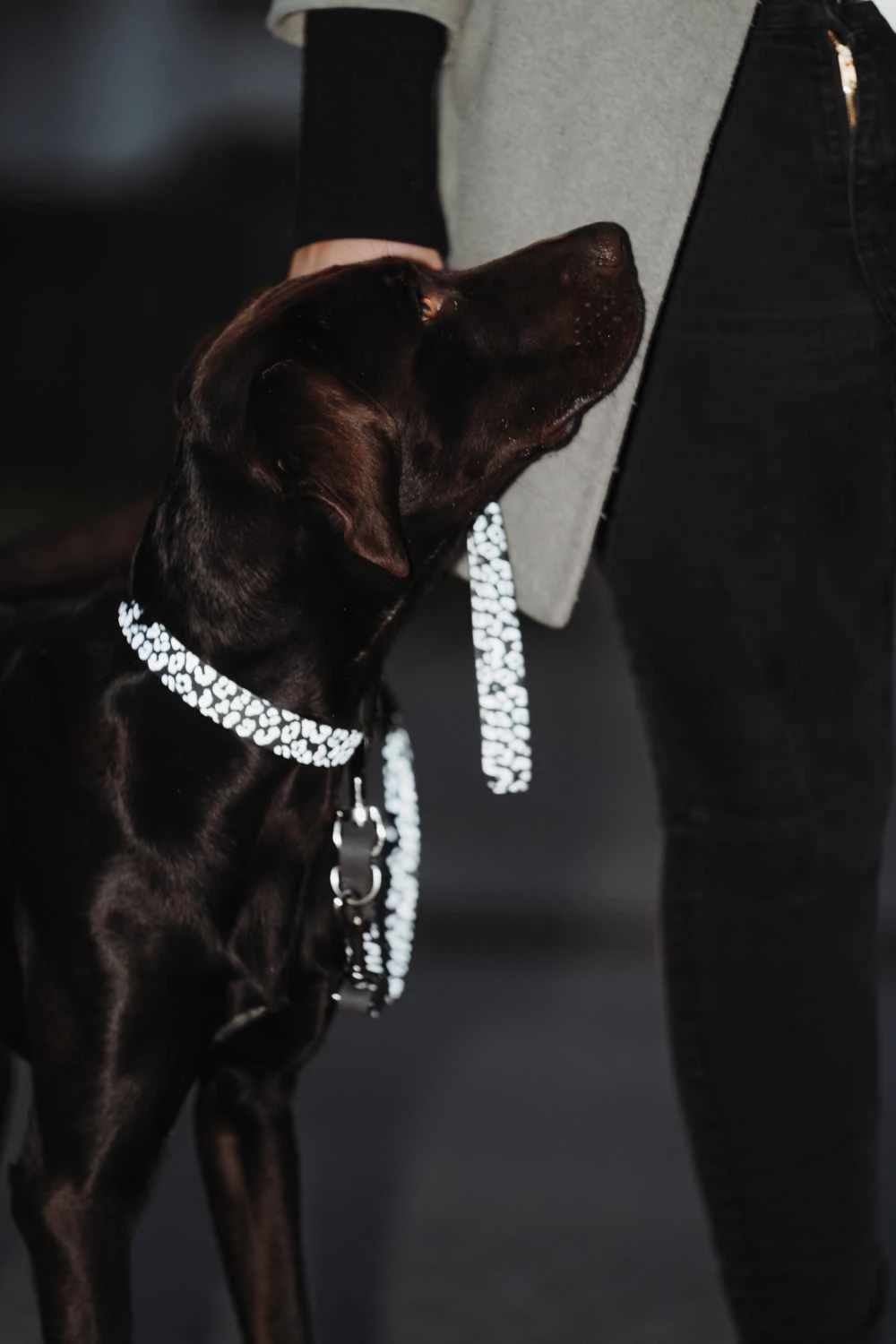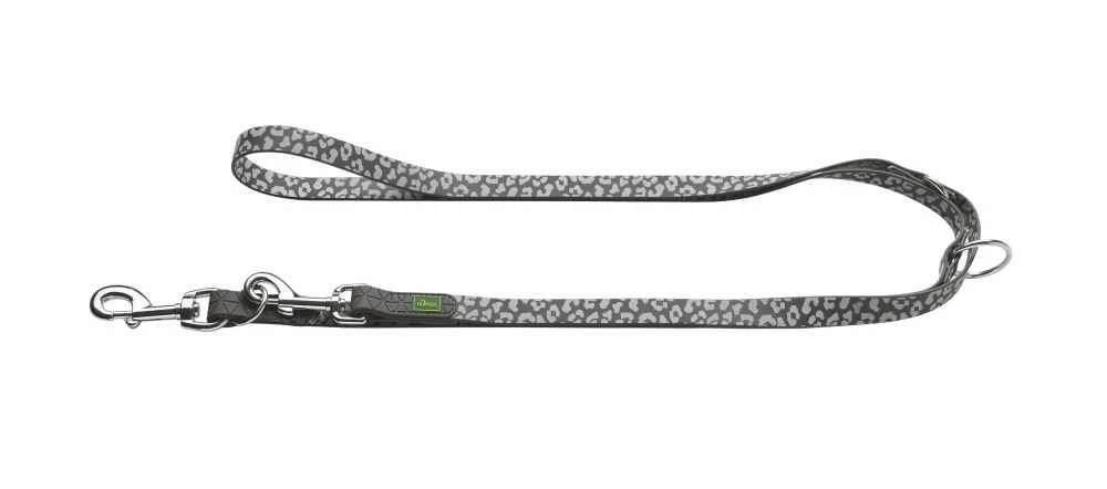Deze chique grijze lijn valt op door de luipaard print. Het lichte materiaal reflecteert zelfs de koplampen van auto’s, fietsen etc. Dit betekent dat baasjes en hun honden goed te zien zijn, zelfs bij slecht zicht en op grote afstand. Dankzij de drie verstelmogelijkheden past deze riem zich moeiteloos aan elke situatie aan: een lange riem om te wandelen, een korte riem om te trainen of een wandeling door de binnenstad. De lijn is in een mum van tijd correct ingesteld. De karabijnhaken en ringen zorgen voor bevestiging aan de halsband of het tuigje. De hondenriem is gemaakt van innovatief en bijzonder robuust kunststof. Hierdoor hoeft het nauwelijks onderhouden te worden. Als de riem nat en vuil wordt door een duik in koud water of een lang modderbad, kan hij binnen enkele seconden worden afgewassen en gedroogd. Meer zorg? Niet nodig.