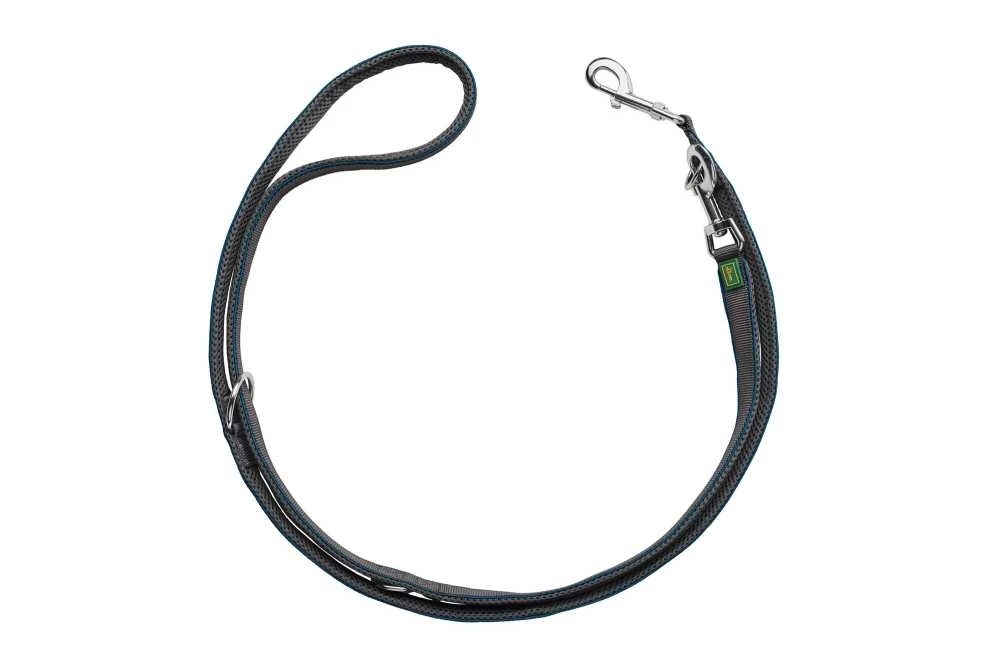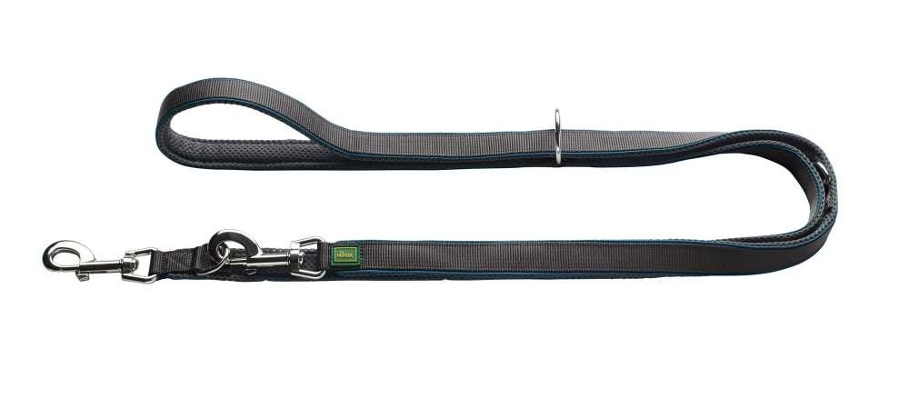 Een praktische grijze hondenriem, die is gemaakt van robuust nylon. De riem is gevoerd met zacht mesh materiaal, zodat deze bijzonder comfortabel is voor uw handen. De riem heeft een handvat en is drievoudig verstelbaar. Door de donkerblauwe biezen past de lijn perfect bij de halsbanden en tuigen uit de Divo serie.
