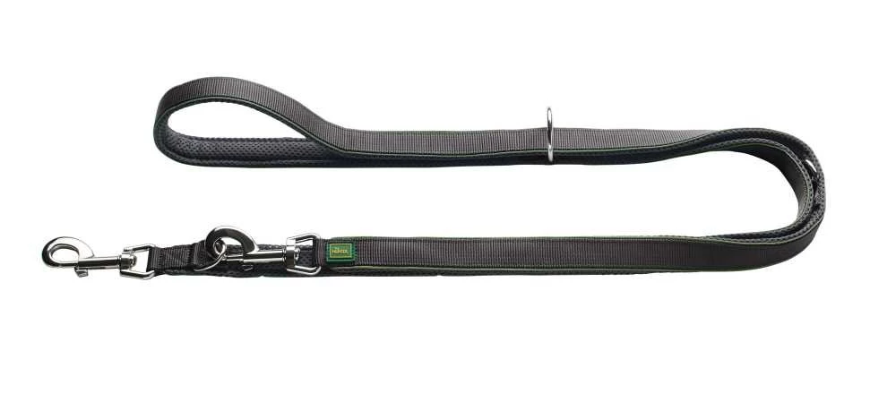 Een praktische grijze hondenriem, die is gemaakt van robuust nylon. De riem is gevoerd met zacht mesh materiaal, zodat deze bijzonder comfortabel is voor uw handen. De riem heeft een handvat en is drievoudig verstelbaar. Door de groene biezen past deze lijn perfect bij de halsbanden en tuigen uit de Divo serie.