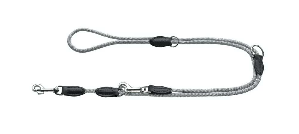 Dit is een mooie grijze hondenriem die is gemaakt van duurzaam polyamide touw. Het materiaal is waterafstotend en weerbestendig. De riem heeft dan ook weinig onderhoud nodig, het vuil kunt u er met een vochtig doekje vanaf halen. Deze hondenriem kan drievoudig worden versteld.