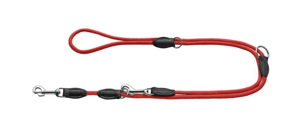 Dit is een mooie rode hondenriem die is gemaakt van duurzaam polyamide touw. Het materiaal is waterafstotend en weerbestendig. De riem heeft dan ook weinig onderhoud nodig, het vuil kunt u er met een vochtig doekje vanaf halen. Deze hondenriem kan drievoudig worden versteld.