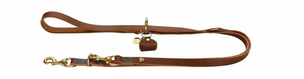 Deze cognac kleurige hondenriem is gemaakt van sterk en slijtvast rundleer. U kunt de riem drievoudig verstellen. De riem is voorzien van messing haken en ringen. Een fraai detail zijn de felblauwe stiksels die een mooi contrast vormen met het leer.
