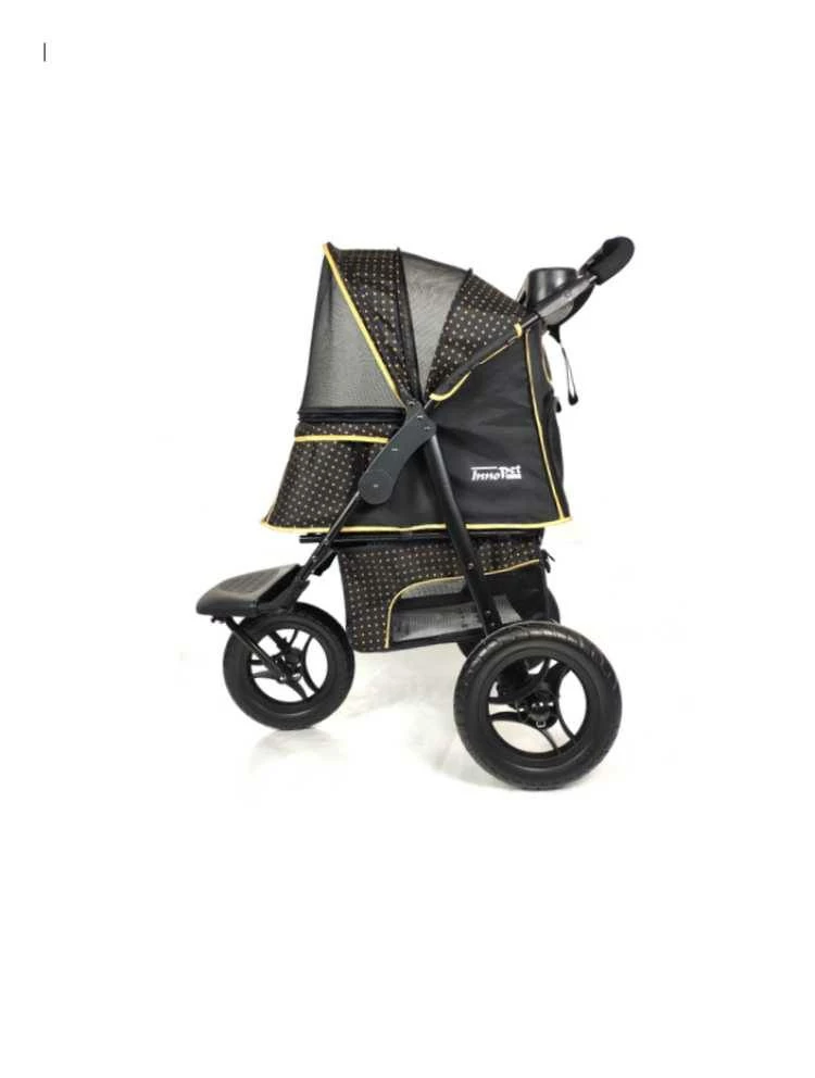Dit is een mooie zwarte hondenbuggy die geschikt is voor honden tot 30 kg. Dit nieuwe model is voorzien van vele extra’s. De flap aan de voorzijde met het Innopet logo kan geopend worden. Het gaas aan de voorzijde klapt omhoog in de kap, in tegenstelling tot andere modellen waarbij de kap in het liggedeelte wordt opgeborgen. Door het nieuwe systeem heeft uw hond meer ruimte in het liggedeelte. Een dik kussentje in het liggedeelte maakt het verblijf van uw huisdier extra comfortabel.