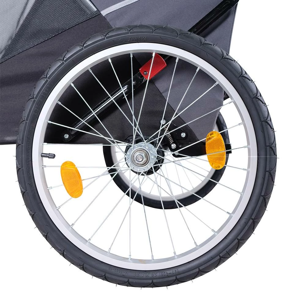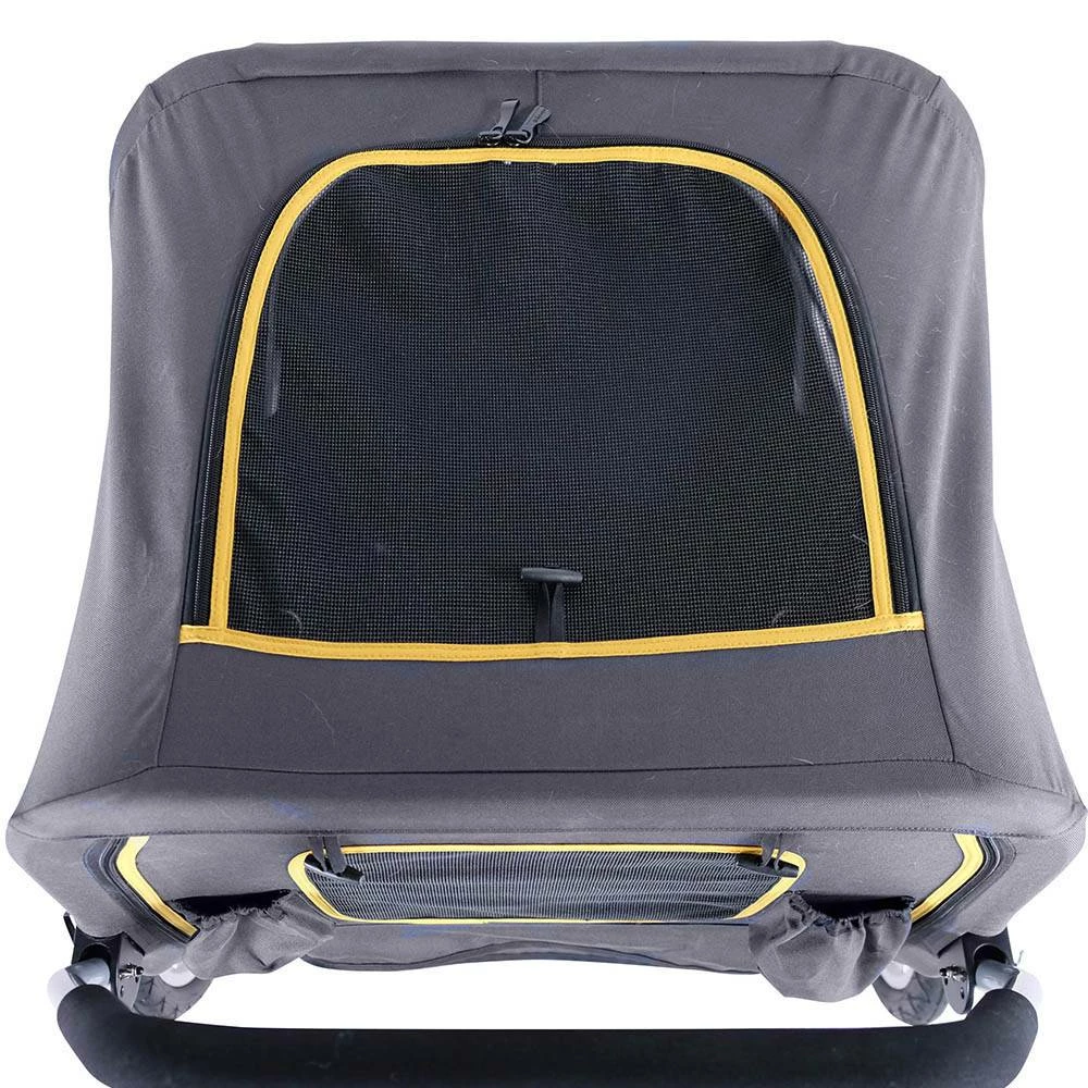 Dit is een grijze hondenbuggy met luchtbanden die speciaal is ontwikkeld voor grotere honden. Het stevige aluminium frame is geschikt voor honden tot 50 kg. Deze buggy behoort tot de allergrootste modellen hondenbuggy’s. De hondenbuggy biedt voldoende plaats aan de hond om te zitten of om te liggen. De luchtbanden kunnen snel en eenvoudig worden geplaatst en worden verwijderd. De duwstang is in drie hoogtes verstelbaar. De buggy heeft verder een voetbedieningshendel om gemakkelijk te kunnen manoeuvreren over stoepranden en andere obstakels. Aan de achterzijde zit een handig opbergvakje.