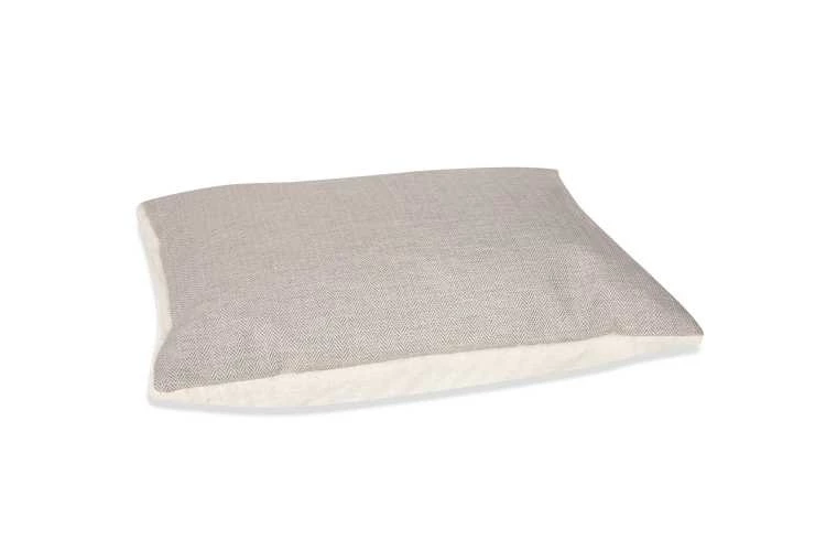 Dubbelzijdig hondenkussen met keuze tussen zacht Sherpa fleece of bijpassende stof bij de hoes van de hondenmand.