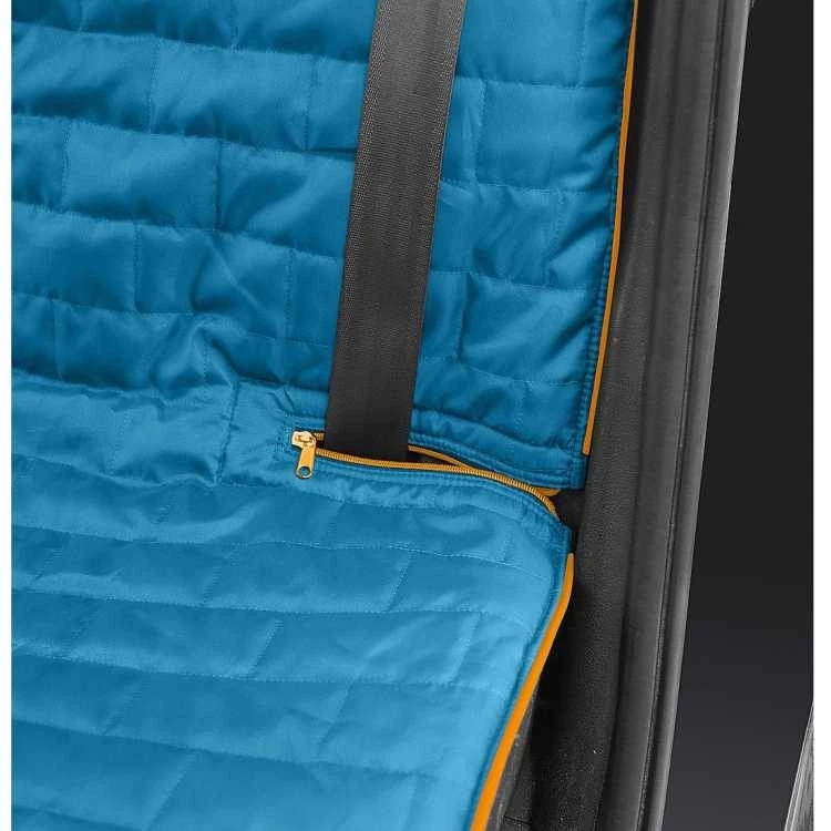 - Diverse openingen in de deken met ritssluitingen zorgen ervoor dat aanlijnriemen, autogordels, en autozitjes nog gebruikt kunnen worden
